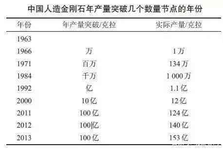 1963年中国就用国产的两面顶压力机造出了我国颗人造金刚石;1964年就改造出了六面顶压力机,并在1966年投入量产并产出了一万克拉的人造金刚石,从此中国就在人造金刚石方面保持着绝对优势。到了2018年,中国的人工钻石产能,已连续十多年稳居世界之冠,并占全球总产量的90%以上。