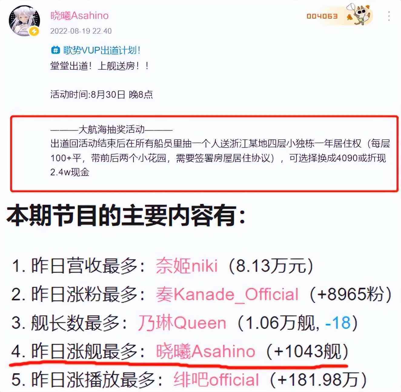 有了前一次“出道回”的企划打底,“晓曦Asahino”的“富婆”人设多了几分可信度。而比前一次“上舰送房”手笔更大的“上舰送黄金”的消息,也很自然地在“晓曦Asahino”发出动态后,于整个B站的虚拟主播圈不胫而走。