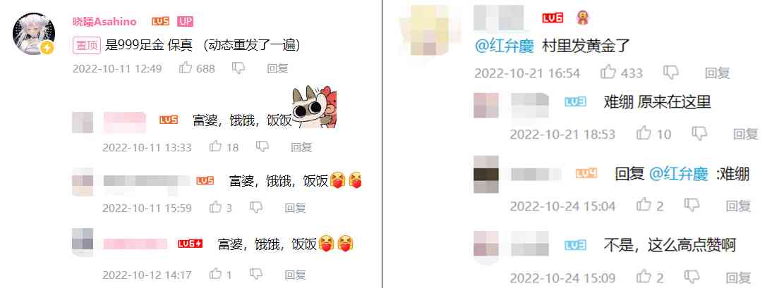 一方面,大家在“晓曦Asahino”的发言下开始玩起了“富婆,饿饿,饭饭”梗的排队接龙;另一方面,他们也开始于各大社交软件聊天群中,奔走相告“富婆送黄金”的离奇新闻。
