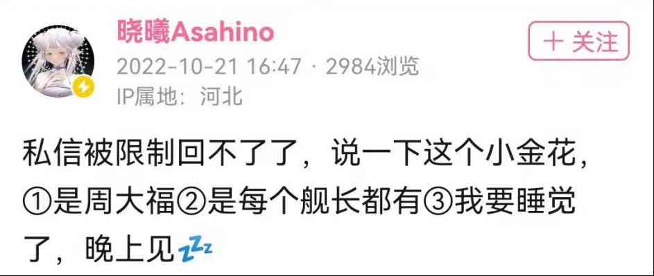 为了平息争议,“晓曦Asahino”在动态中进一步说明了自己送出的金花属于著名品牌“周大福”的产品。同时,也在各种不同的场合强调了克重有1克左右。