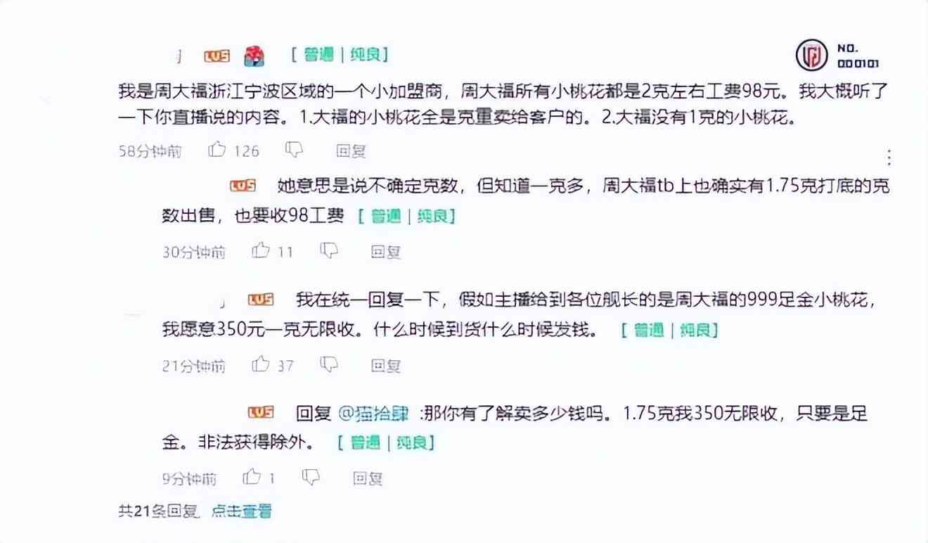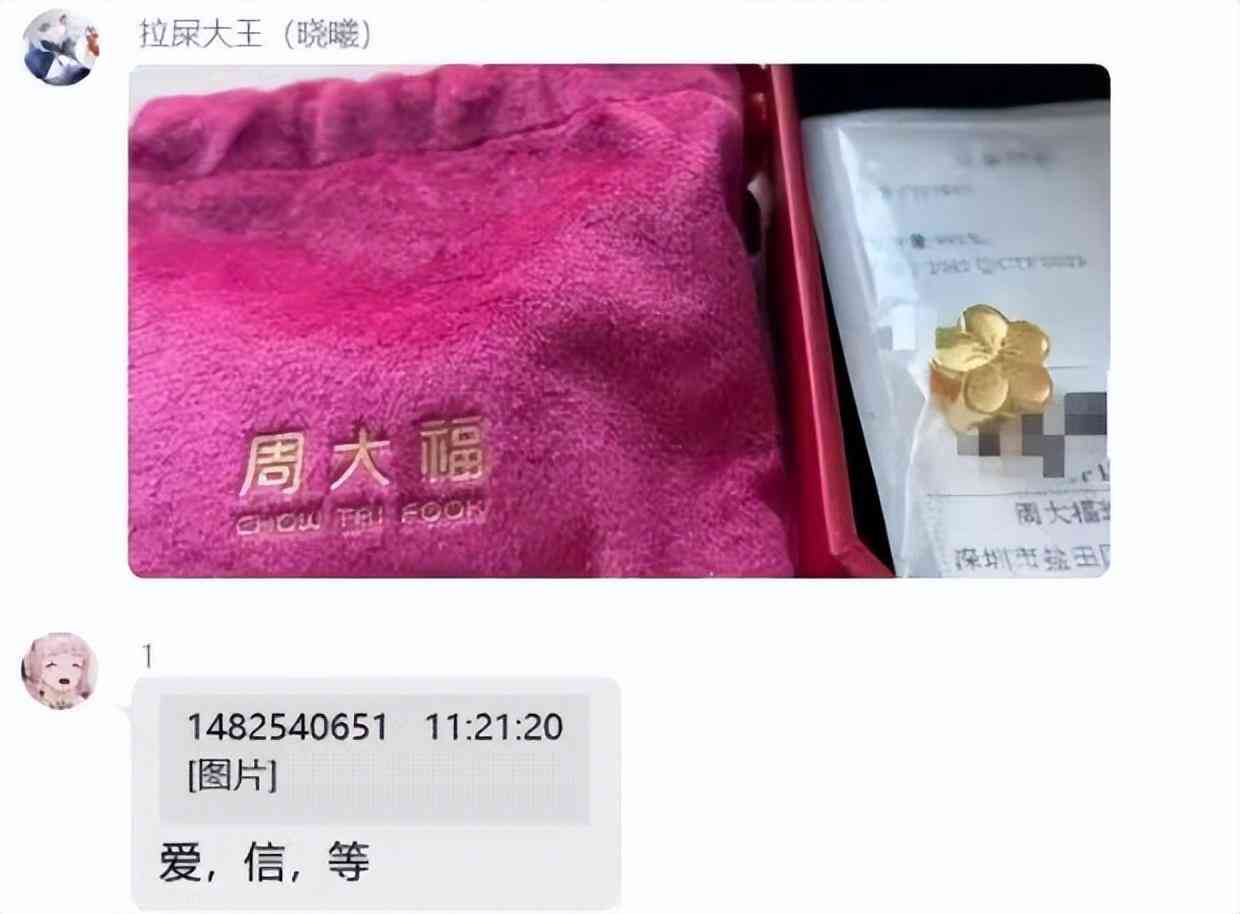 在粉丝群里,她也晒出了含有“周大福”包装与证书的金花照片。