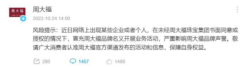 紧接着,“周大福”品牌官方也发布了一则声明,称有人于近期冒充“周大福”名义开展业务活动,劝消费者理性消费。虽然这则声明中并没有指名道姓,但考虑到其发布的时间点,其具体的指向不言而喻。