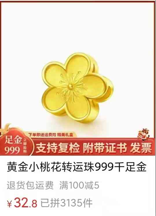 与此同时,还有很多网友在各大社交媒体中,晒出了拼多多上找到的,与“晓曦Asahino”提供的图片中造型高度类似,但价格只有32.8元的小金花。言下之意是“晓曦Asahino”送出的“999足金”,可能与大家所理解的,存在一定程度上的差距。