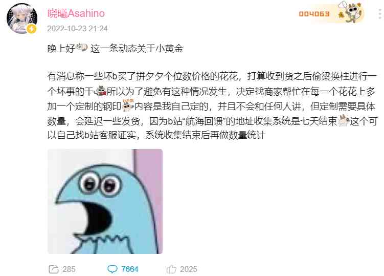 尽管“晓曦Asahino”在后续动态中仍然保持着相当坚定的态度,并表示为了防止网友们所担心的情况出现,会在自己送出的小金花上加定制钢印。