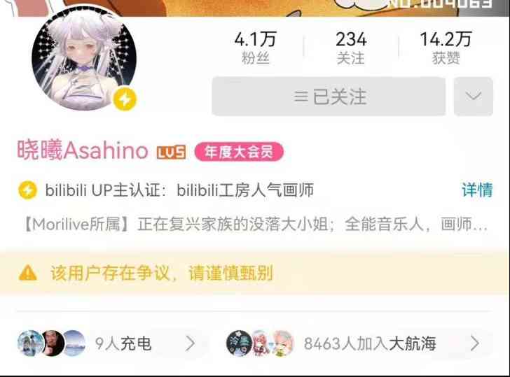 一地鸡毛的局面,你来我往的证明与质疑,最终让“晓曦Asahino”的账号被B站官方打上了“争议”标签。