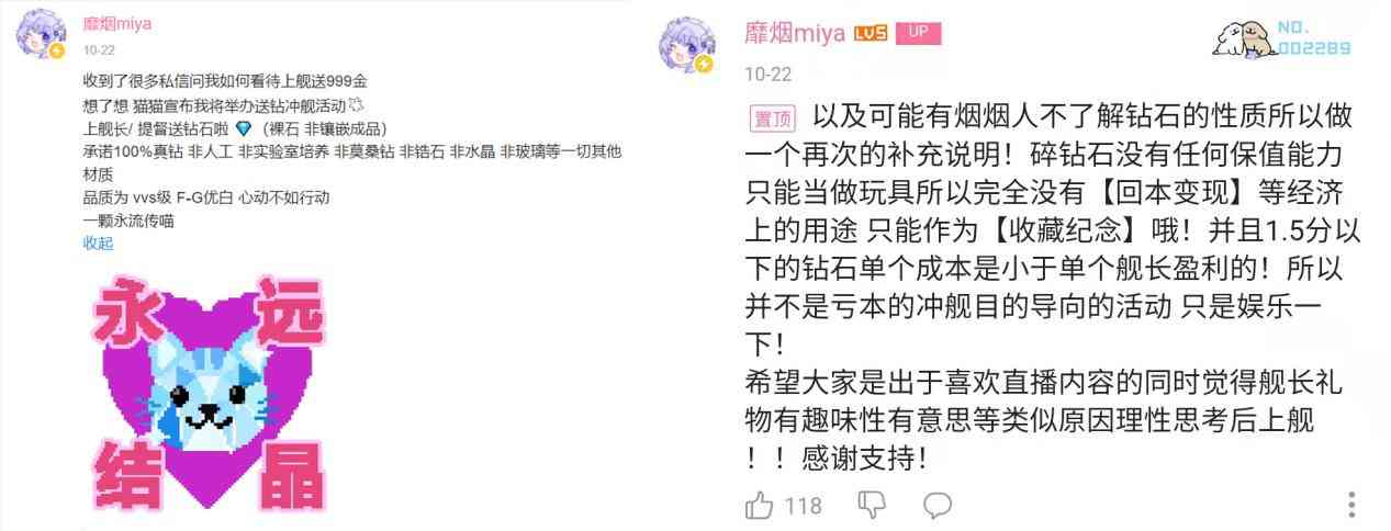 “靡烟miya”是顺着“上舰送黄金”的思路往下延伸,开展“上舰送钻石”的活动。但她仍然在考虑“情感”与“利益”的界限,于动态评论中强调,她所送出的钻石不具备任何保值能力,仅仅只是为了增加舰长礼物的趣味性而送的。