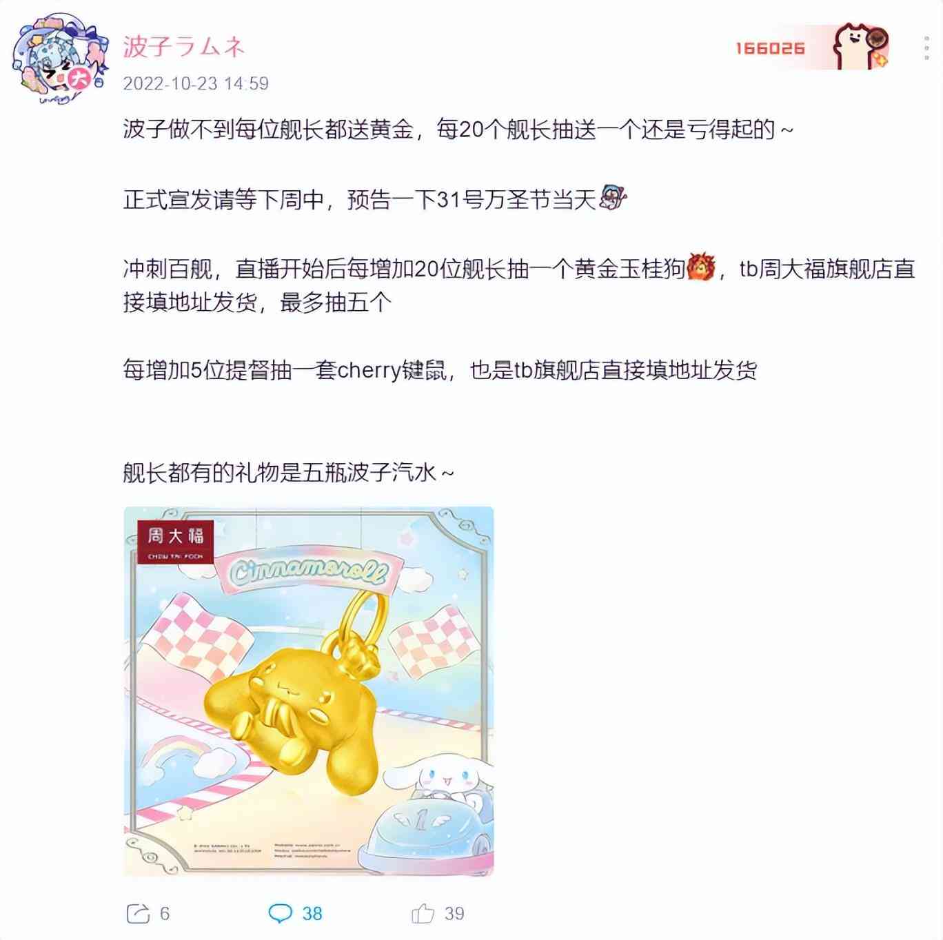 而“波子ラムネ”则是原样复刻了“晓曦Asahino”的思路,直接做起了“上舰送黄金”的企划。但她没有选择如“晓曦Asahino”那般夸张的送法,而是很克制地限定在了“每20个舰长送1个,上限5个”的范围内。
