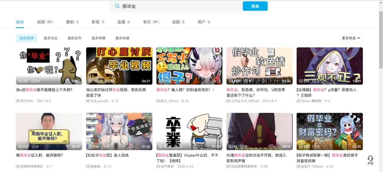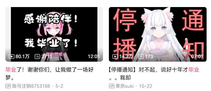 B站的虚拟主播“假毕业”是与“毕业即生涯巅峰”伴生的奇特场景。有着为数不少的虚拟主播在认识到“毕业=热度”之后,纷纷选择了“假毕业”来让自己收获一波关注。从而,又衍生出了一系列吐槽“假毕业”的V圈切片,形成了一个在全世界范围内都十分罕见的V圈生态。