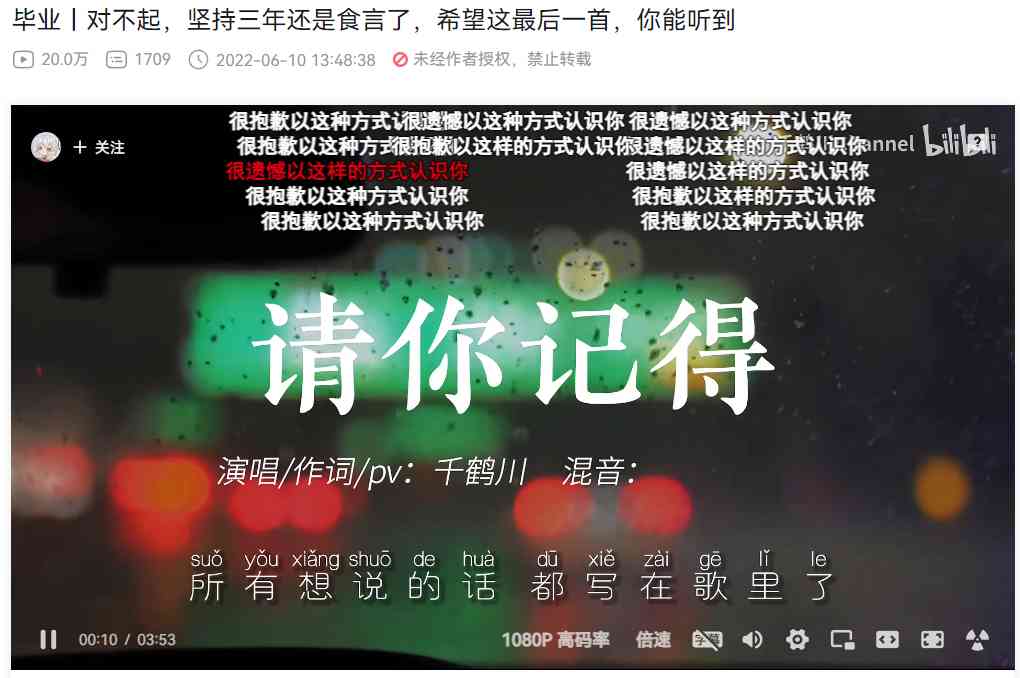 这种情况见得多了,导致“很遗憾以这种方式认识你”变成了一种定型了的句式。在每一个VUP的毕业视频中,你能够看到最多的评论与弹幕,都以这种方式呈现。