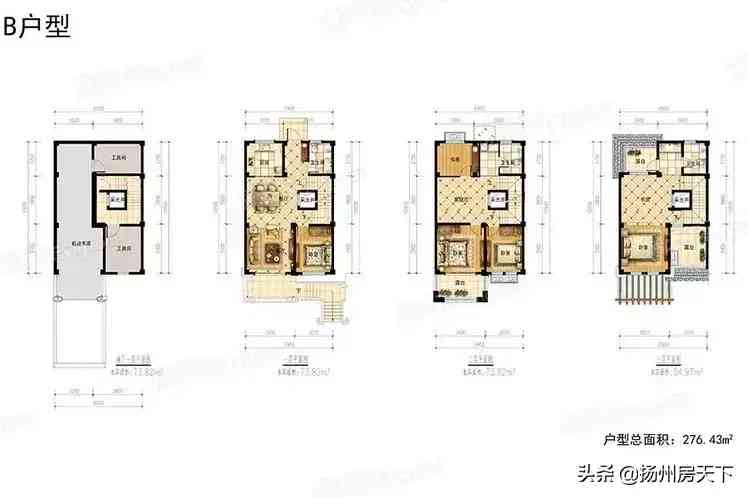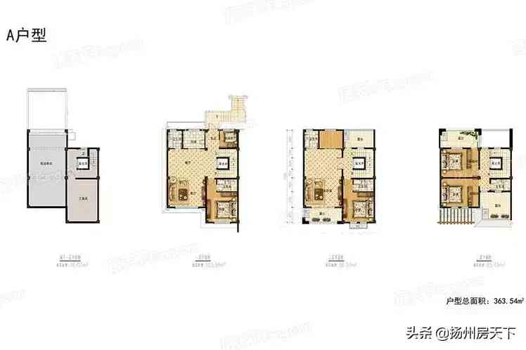 户型建筑面积约240-276㎡联排别墅、330-370㎡双拼别墅,从产品看无可挑剔,庭院、露台一个都不能少,在一楼也设置了卧室,满足老人的方便居住,得房率达97%以上,光是赠送面积就达到150平以上。