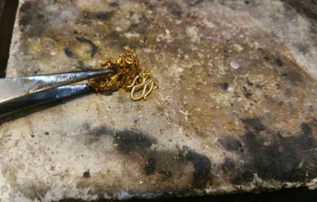 那板上有一个已经烧过的凹坑,把金子放在凹坑中,再用吹氧的火枪来烧熔黄金。烧熔后把黄金倒入已经选好的首饰模型中(石膏制成),再用黄泥巴来压模。压完后,待一阵子,马上把黄泥和石膏敲开取出已成型的黄金首饰,放入硝酸溶液中清洗一下,最后用抛光机抛光,这样金银匠完成作业之后再把首饰放到天平秤上去再秤一次,前后的重量可以说是分好不差.。然后顾客心满意足十分放心的戴着新打好的金首饰走了。