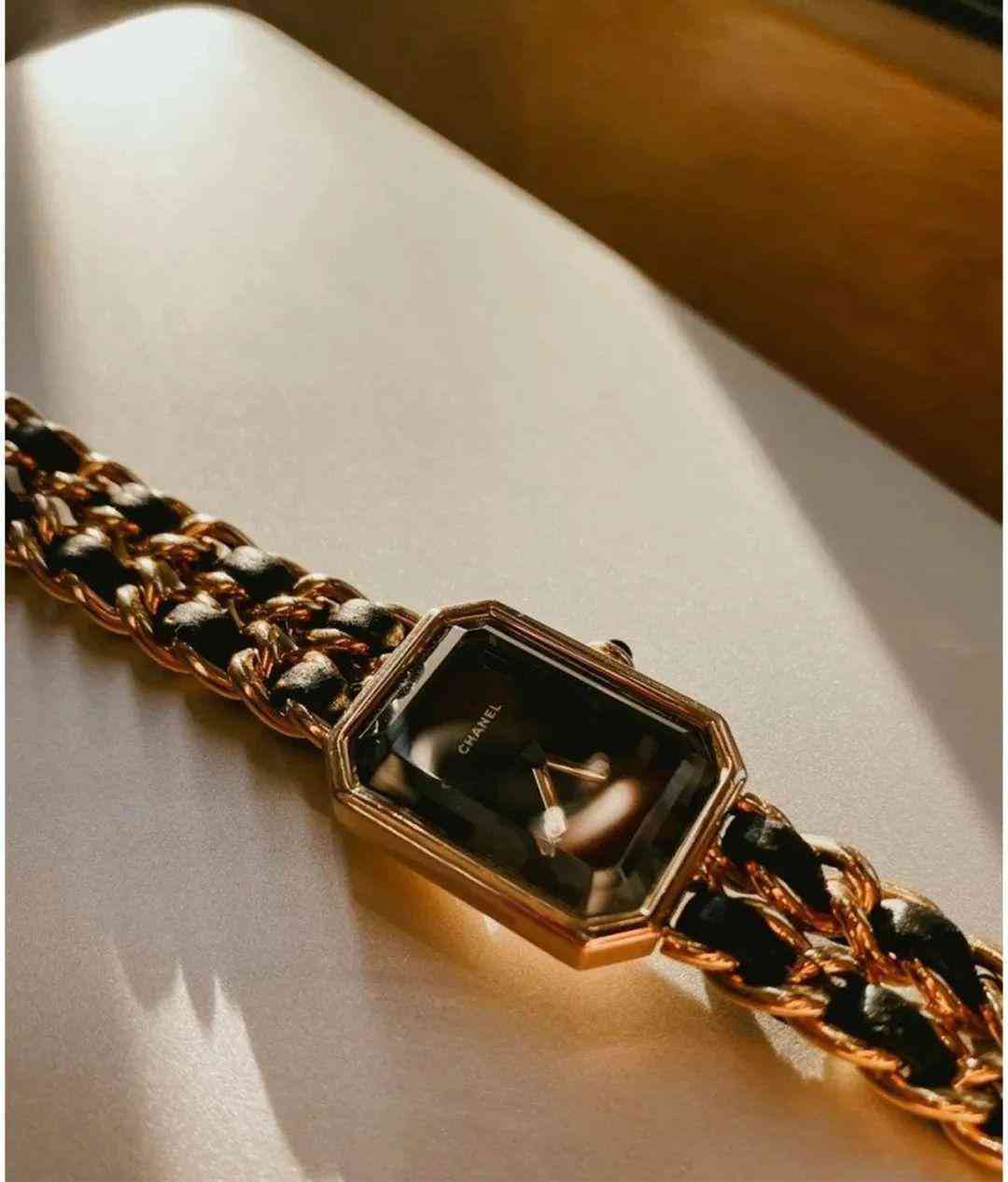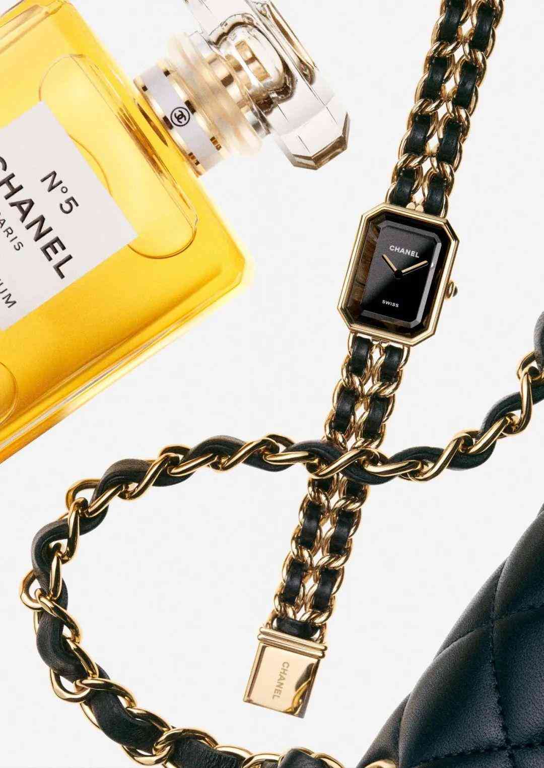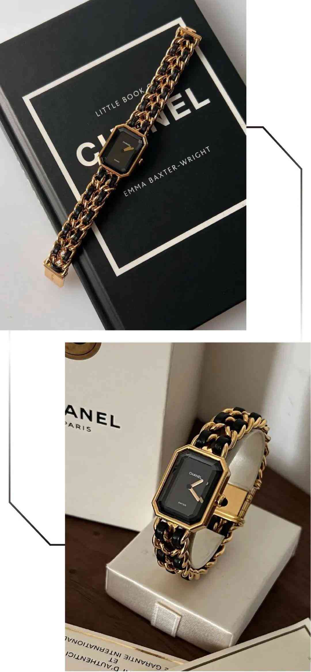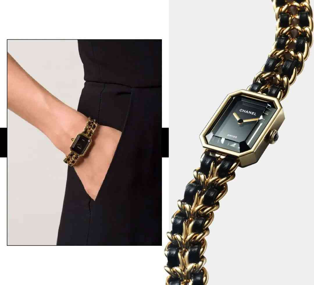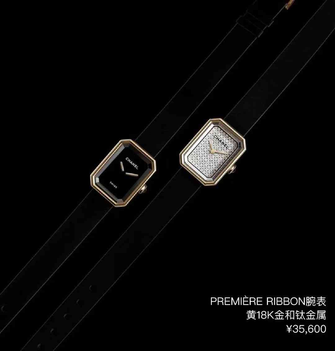 方形表壳灵感取自芳登广场以及CHANEL N°5香水瓶盖的八角形,表带则让人联想起香奈儿包款最具标志性设计之一的皮革穿链。可以说黑金方糖Première开局就是开得好。