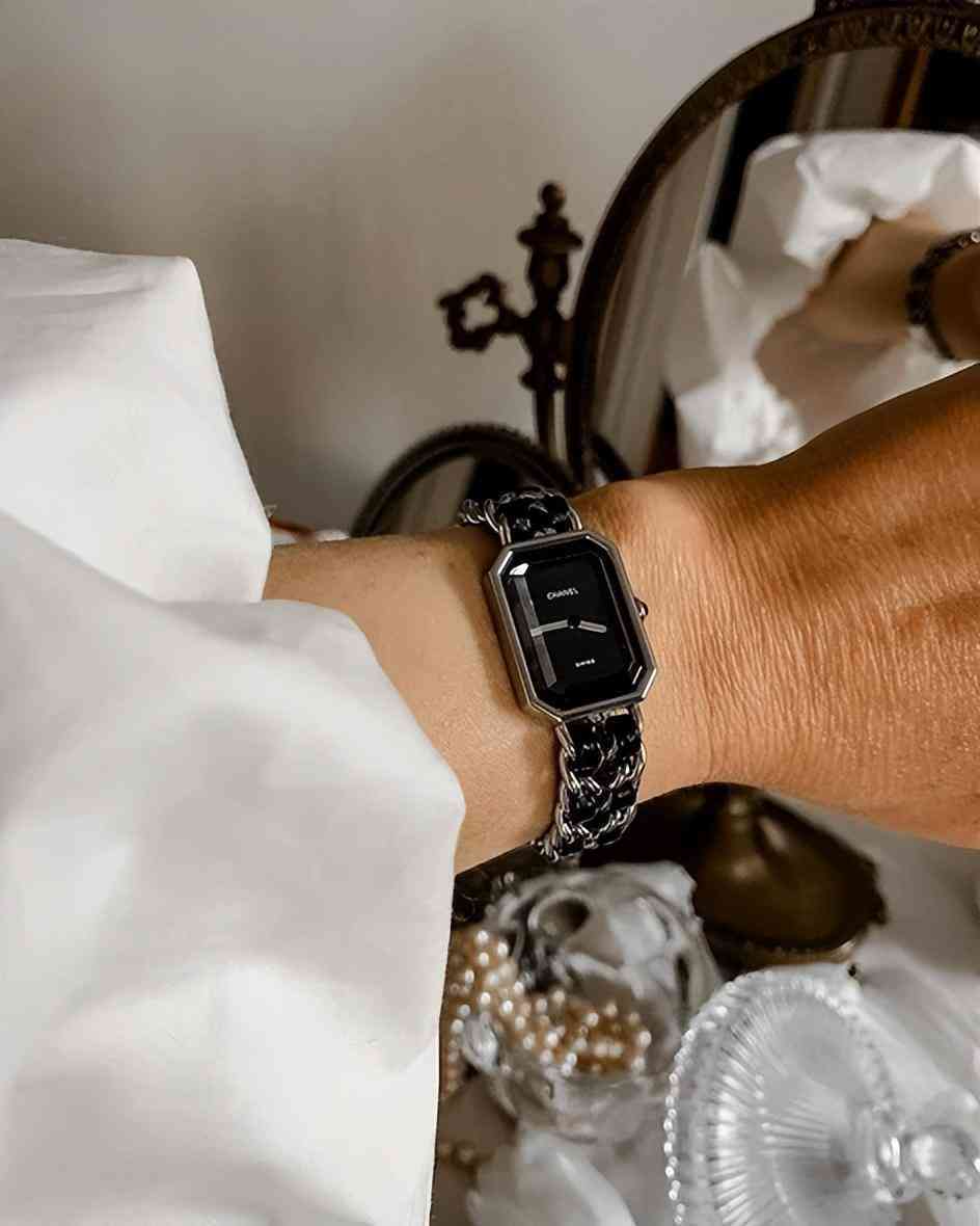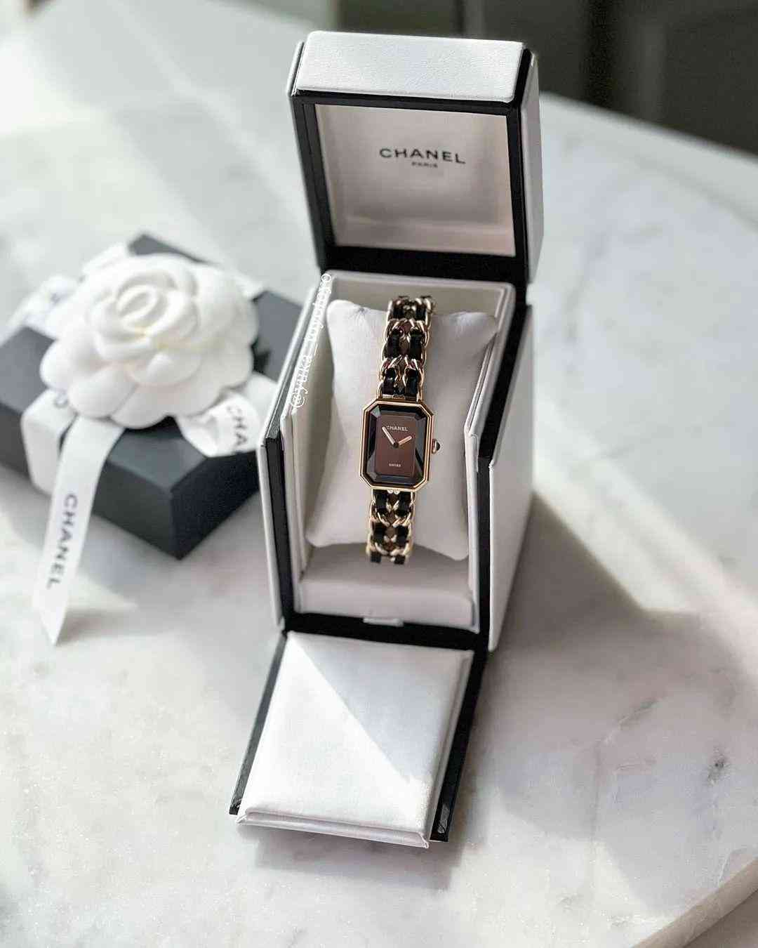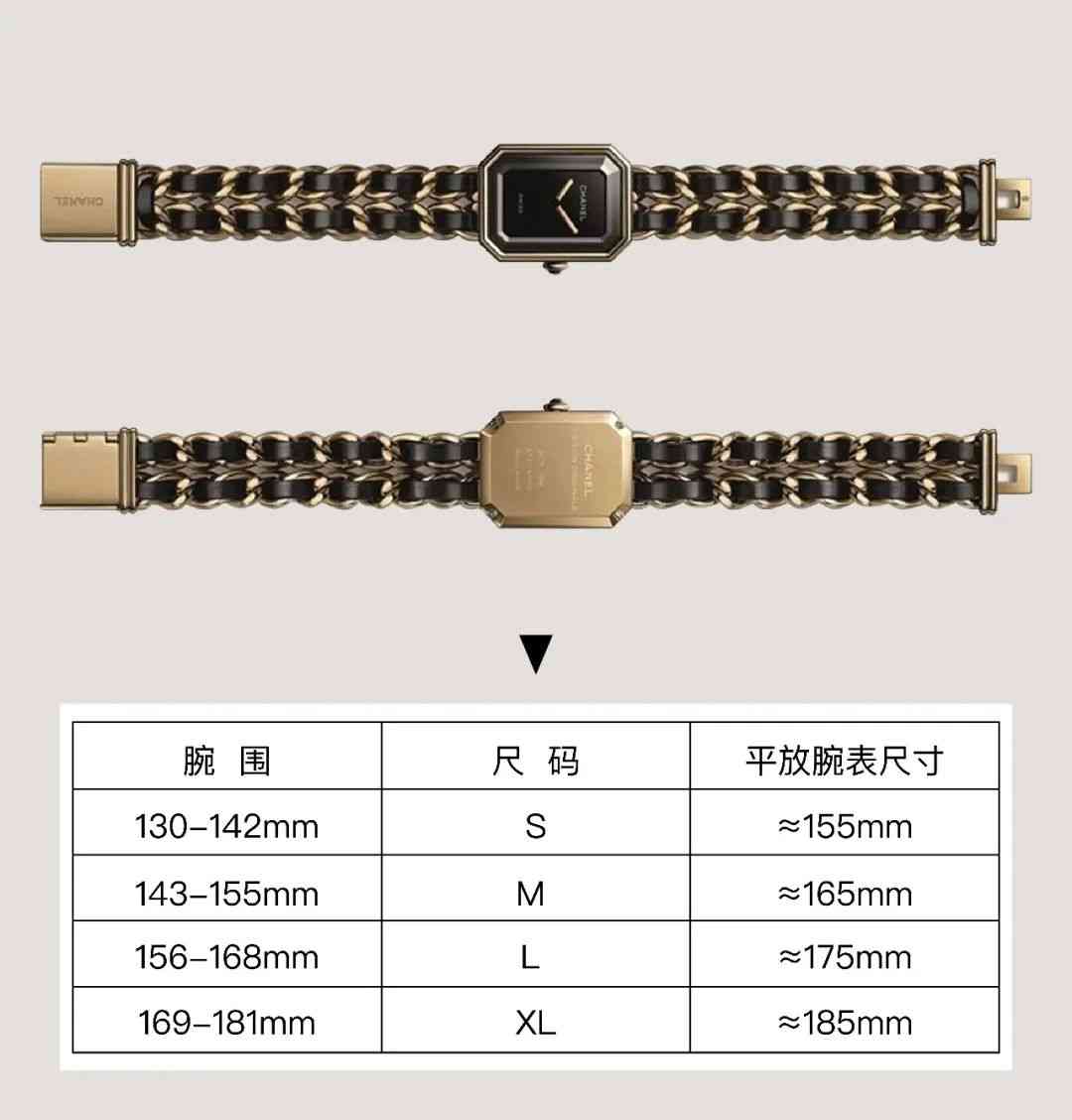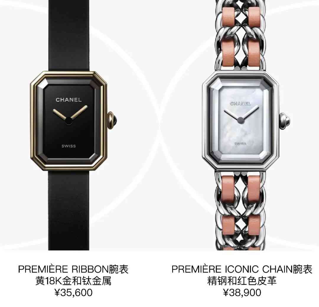 方形表壳灵感取自芳登广场以及CHANEL N°5香水瓶盖的八角形,表带则让人联想起香奈儿包款最具标志性设计之一的皮革穿链。可以说黑金方糖Première开局就是开得好。