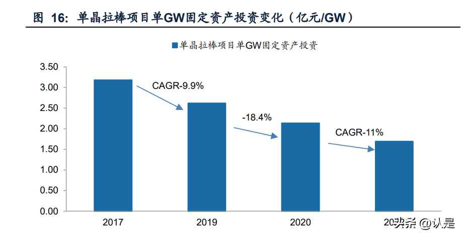 产业链技术进步导致硅片设备单位投资下降。由于拉晶技术进步、工艺提升、设备 更新换代及硅片薄片化等因素,每GW硅片设备投资有所下降。例如,天合光能年产 35GW直拉单晶项目由于采用N型技术路线,对应N型电池光电转换效率更高,并且 采用薄片工艺,单位产能所需的硅棒产量更少,因此单位产能所需的单晶炉等核心 设备的数量更少。以过去五年间各家公司的单晶拉棒扩产项目为例,我们测算出平 均单GW固定资产投资额下降较快,2017-2022年年均降幅为12%。