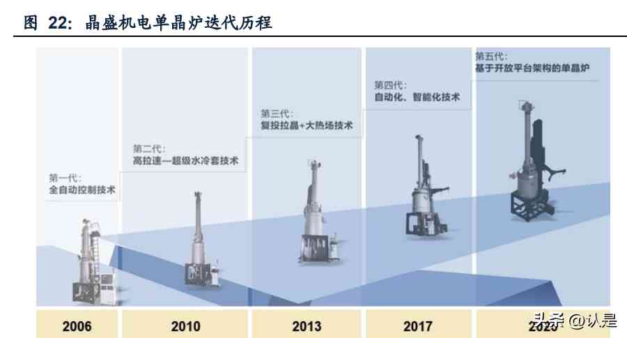 公司产品迭代能力优秀,平均3~5年推出新一代单晶炉。2006年,晶盛机电推出第 一代全自动单晶炉;2010年研发出水冷套装置,实现高拉速第二代单晶炉;2013年 研发出复投器+大热场,开创第三代RCZ高产单晶炉;2017年研发出基于工业互联网 的第四代智能化单晶炉。而2023年公司即将推出第五代新型单晶炉,配置了基于开 放架构的用户可编程的软件定义工艺平台,开启新一轮迭代升级。