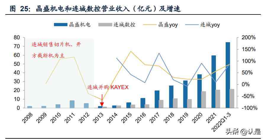 发展路线不同:晶盛单晶炉起步早、积累深,先发优势强。连城初期以硅片生产的 后道设备为主,主要销售硅片开方截断机等机加设备以及切片机,2008年研制出我 国代具备自主知识产权的多线切割机。不同于晶盛的内生发展路线,连城在单 晶炉领域是通过外延并购起家,2013年通过收购美国KAYEX切入单晶炉市场,并在 2014年实现单晶炉产品的销售。对比连城,晶盛的特点是在单晶炉领域起步较早、积淀较深,具备较强的先发优势。
