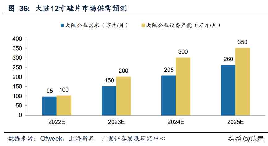 大尺寸硅片供快速增长,带动设备需求扩容。半导体硅片未来主要增量在大尺寸硅 片,根据上海新昇的预测,市场预期从2022年至2025年大陆企业12寸硅片的需求和 供应情况将持续增长。2022年大陆企业需求为95万片,国内产能为100万片。而及 至2024年,国内需求为205万片,国内产能将达300万片。