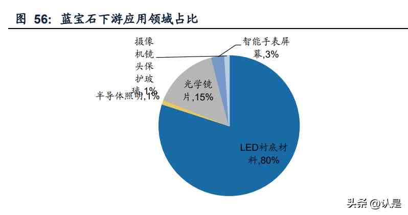 蓝宝石应用领域广泛。蓝宝石俗称刚玉,具有优异的光学性能、机械性能和化学稳 定性,其强度高、硬度大(莫氏硬度为9,仅次于钻石,高于玻璃)、耐冲刷,可在 近2000高温的恶劣条件下工作,因而被广泛的应用于红外军事装置、高强度激光的 窗口材料、半导体发光二极管(LED),是大规模集成电路SOI和SOS及超导纳米结构 薄膜等最为理想的衬底材料等。 LED衬底材料是蓝宝石最重要的应用领域。从蓝宝石下游应用占比来看,LED衬底 占比达80%,光学镜片15%,智能手表屏幕3%,其余应用包括半导体照明、摄像头 镜头保护玻璃等。