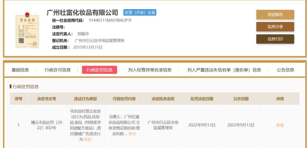 近日,广州壮富化妆品有限公司因违反广告法和化妆品监督管理条例,被广州市白云区市场监管局罚款21万元。处罚事由显示,当事人于2021年10月1日起,在未与带货主播薇娅(黄某)、李某签订产品代言协议的情况下,擅自在其网店待售化妆品中标注“薇娅推荐”“李佳琦推荐”字样、擅自使用薇娅肖像,且在无任何证据证明的情况下,在待售产品封面标注“当天祛斑”的疗效描述,构成虚假广告行为。此外,当事人在化妆品经营过程中,未按要求建立并执行化妆品进货查验记录制度等。