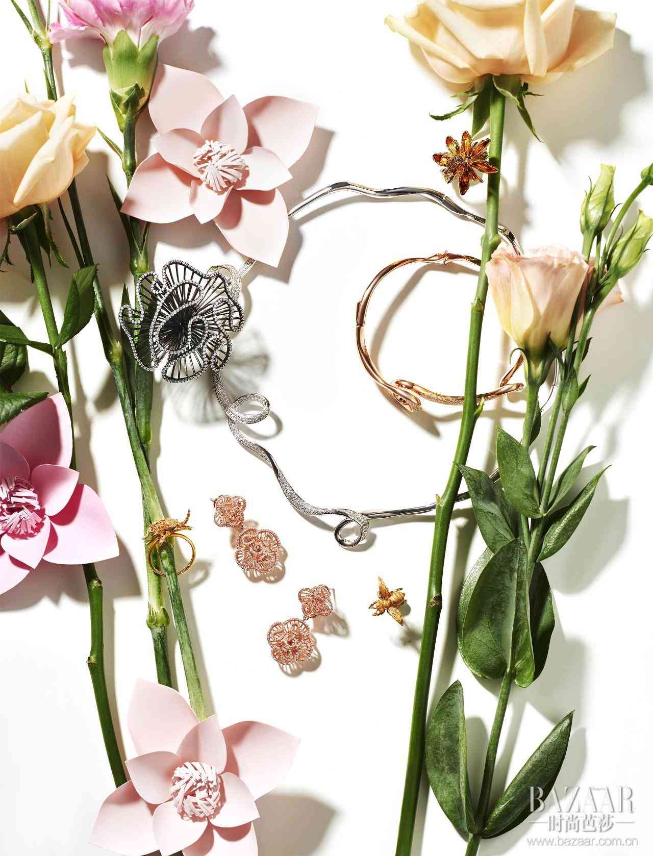 镂空立体花朵戒指、曲线型白金色项圈、曲线型玫瑰金色手镯、镂空立体花朵耳环 All by FEI LIU