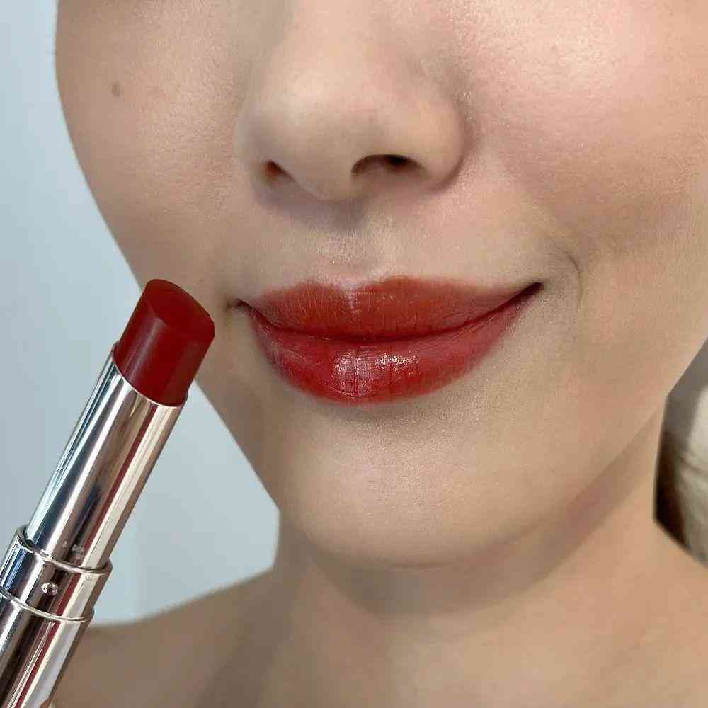 #DIOR8是主推色,浓郁的番茄砖红色,自带复古气质,基本不挑皮。而#100是很温柔的奶油杏仁色,属于自然裸色系,可以和其他口红叠涂。