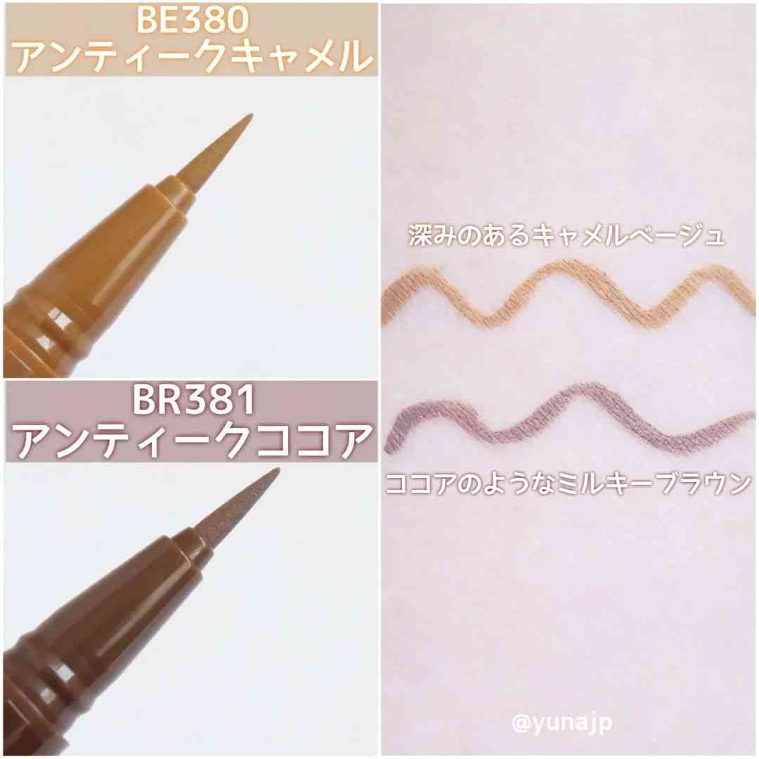 细笔头,弹性适中,方便勾勒精致眼线。#BE380是深驼色,比黑色和棕色颜色更浅,呈现出来的眼妆柔和自然、