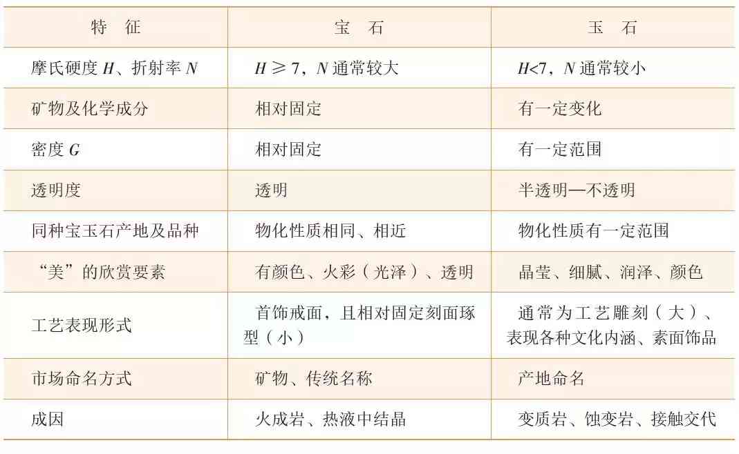 就珠宝的大类来说,可分为宝石与玉石两大类。宝石是天然矿物单晶体,玉石则指天然矿物的集合体。两者在矿物成分构成、物理化学性质、接受的人群、饰品的表现形式上尽管有相似之处,但更有差异,这是选购珠宝者应该了解的。宝石与玉石的异同见表3-1。这里的玉石主要指接受面较广、市场占有率较高的翡翠、和田玉,宝石指以钻石、红蓝宝石、祖母绿、海蓝宝石、碧玺、石榴石等为代表的常见宝石。