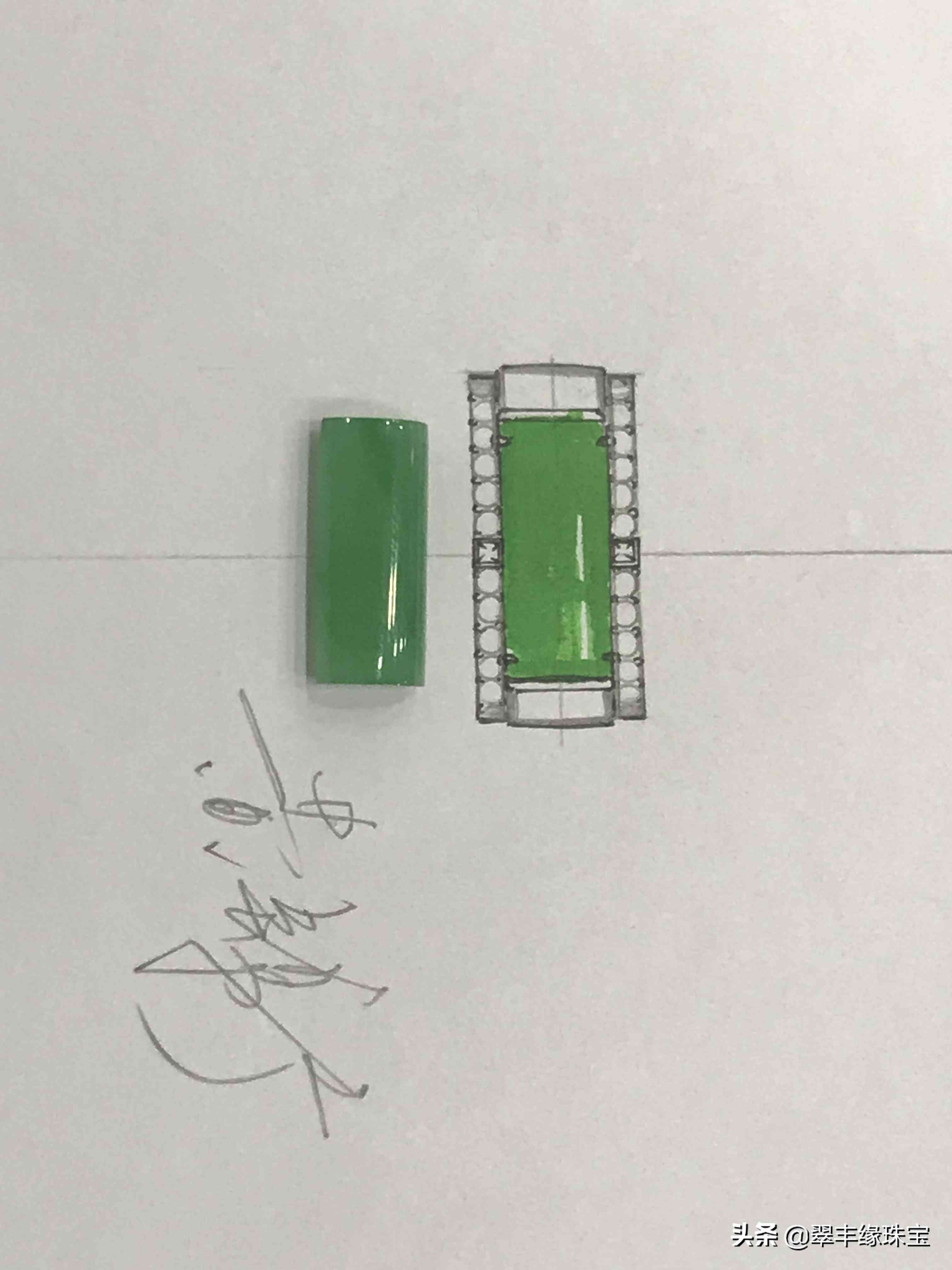 全网为之狂热的5.20刚过,小黄却有个迟来的骚想法,他翻出自己刚从揭阳淘回的高质量的绿色马鞍戒面,找来了笔和纸,一顿行云流水般的操作后出来了一个男戒的设计图,虽说是心血来潮的设计,但是真的非常好看,至少本人是相当的喜欢的这款戒指,本以为是哪个粉丝这么有品位,定制这款男戒,不问还好,一打听,真是出乎了意料,居然是小黄为自己量身定制的款式,内心吐槽了一句:骚年,任性!