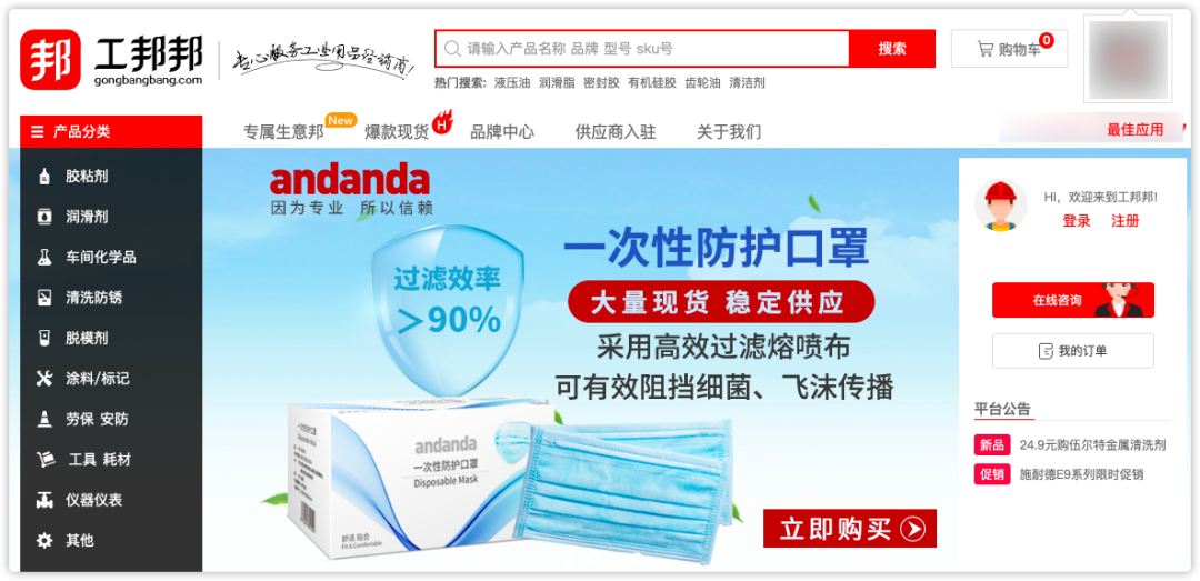 工邦邦也是一个工业产品批发渠道,这个平台更多提供的化学用心,比如粘胶剂,仪器仪盘,涂料等车间化学品,对于小的五金工具略少。