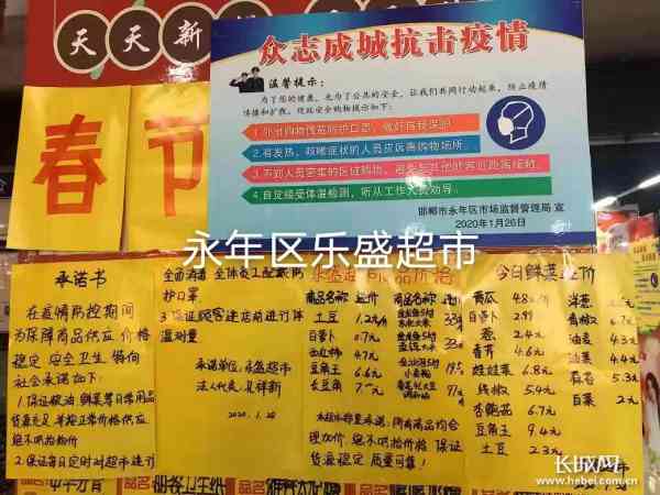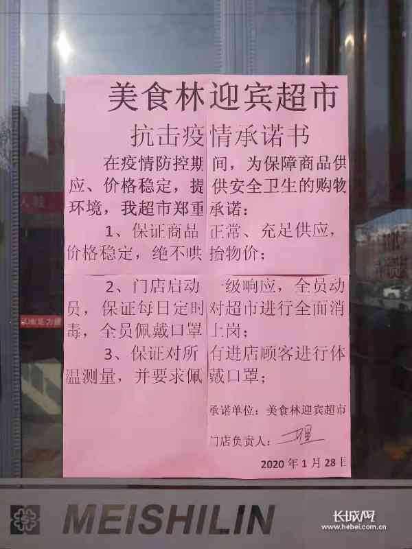 长城网邯郸讯(记者霍文龙 通讯员常领山)“本商场郑重承诺:疫情期间,蔬菜、米面粮油和肉类等生活用品价格不会涨、货源不会断,请大家不要恐慌,不要囤货”,邯郸市永年区美食林超市宣传橱窗的一张大红纸告示十分醒目。1月29日,记者在永年区走访,发现该区超市、商场门口都贴有这样的告示,各大商场、超市、药店内蔬菜、米面粮油和防护用品等基本用品供应充足,价格稳定,没有出现居民抢购风潮。