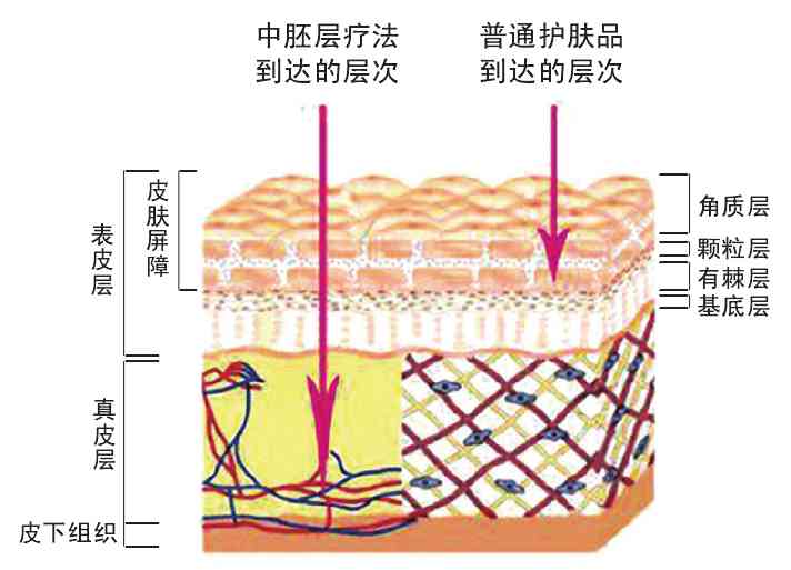 皮肤主要划分为三层,表皮层、真皮层、皮下组织。在皮肤美容领域又有所细分,皮肤的中胚层位于表皮层与真皮层之间,而微针能够让营养成分直接到达中胚层。从这一角度来看,微针不仅能促进成分吸收,还能产生机械性物理刺激,诱导皮肤开启自我修护机制,加速表皮新陈代谢,释放多种生长因子,促进胶原蛋白、弹性蛋白的产生。因此,微针疗法又属于中胚层疗法的一种。