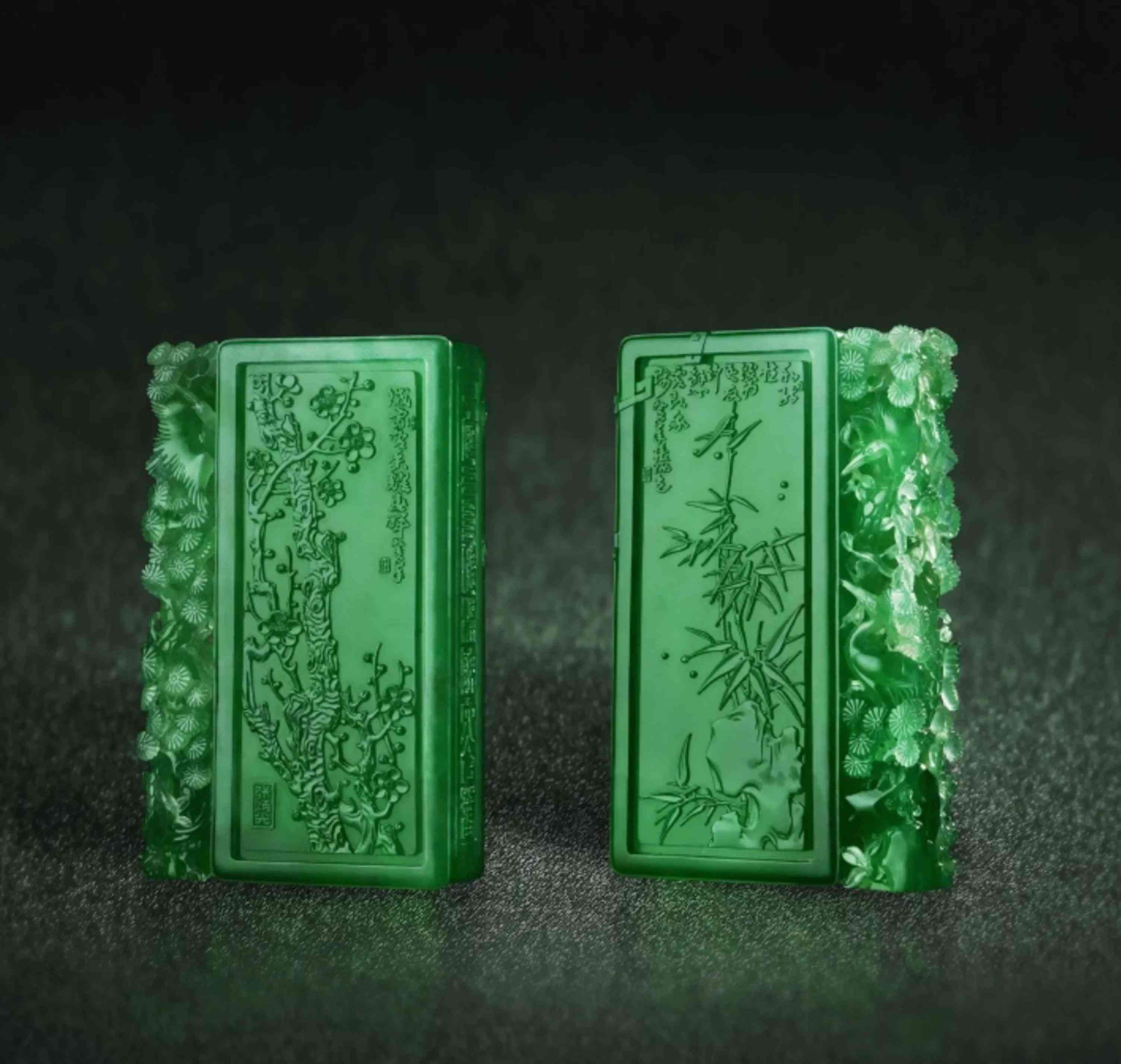 张大师用买来的大玉王毛料,雕刻出了形象逼真的岁寒三友—松、竹、梅,以及由鹿和鹤组成的六合,寓意天下大同、六六大顺。