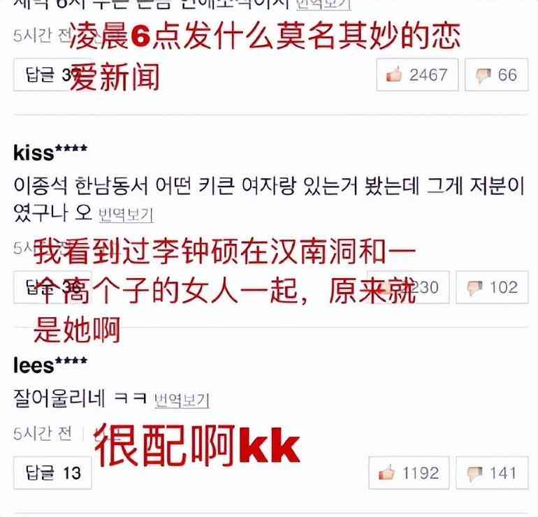 李钟硕和权娜拉私下被扒出很多细节,权娜拉家里有李钟硕出版的诗集,李钟硕好朋友几乎每条都会给权娜拉点赞。权娜拉拍戏时,李钟硕经常送咖啡车应援,韩媒曝光二人的恋爱说后,有网友目击李钟硕和权娜拉曾一起约会。