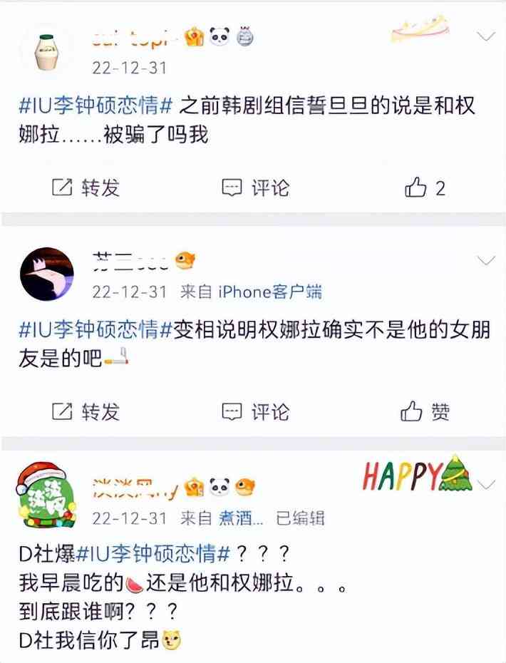 新年一号情侣诞生,IU李钟硕被D社曝光日本秘密约会,二人火速认爱。1月1日,IU和李钟硕分别发布长文,透露对方为自己带来了很多力量,真心希望得到粉丝的认可,看来这次恋情曝光,双方都未事先得到消息,所以才会这么小心翼翼地出来安抚粉丝。