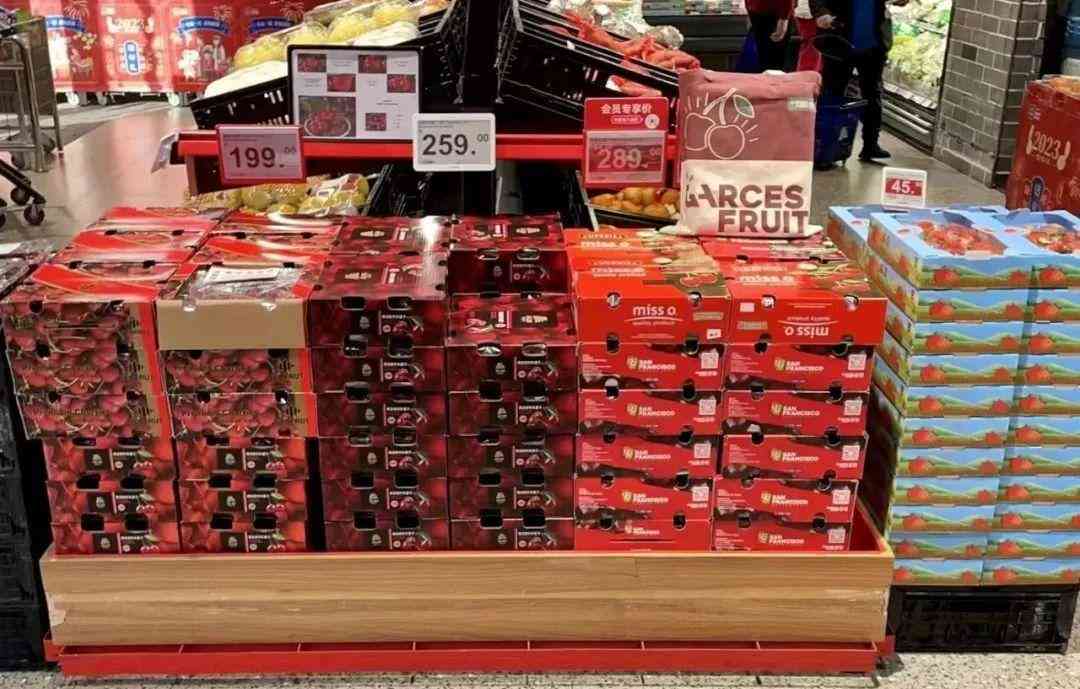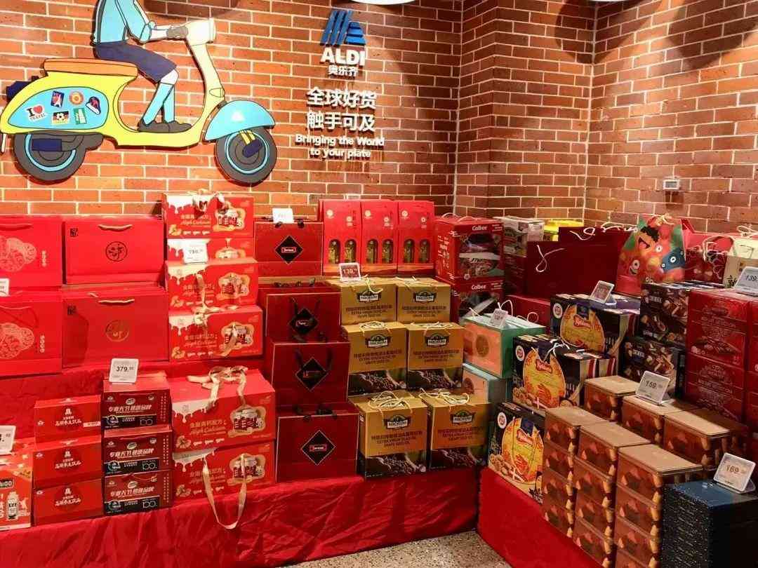 在奥乐齐月亮湾店,商家专门开辟出了年货区和送礼区。送礼区的礼盒琳琅满目,有3J、4J的车厘子、一箱箱的大橙子、各类坚果零食礼包、橄榄油红酒套组、丹麦蓝罐曲奇等等。