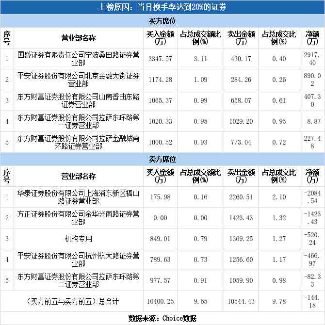 买四为东方财富证券拉萨东环路证券营业部,该席位买入1020.33万元,卖出1029.20万元,净买额为-8.87万元。近三个月内该席位共上榜526次,实力排名第11。东方财富证券拉萨东环路证券营业部今日还参与了曲江文旅(净买额1965.21万元),本川智能(净买额698.97万元),荣信文化(净买额-684.40万元)等10只个股。