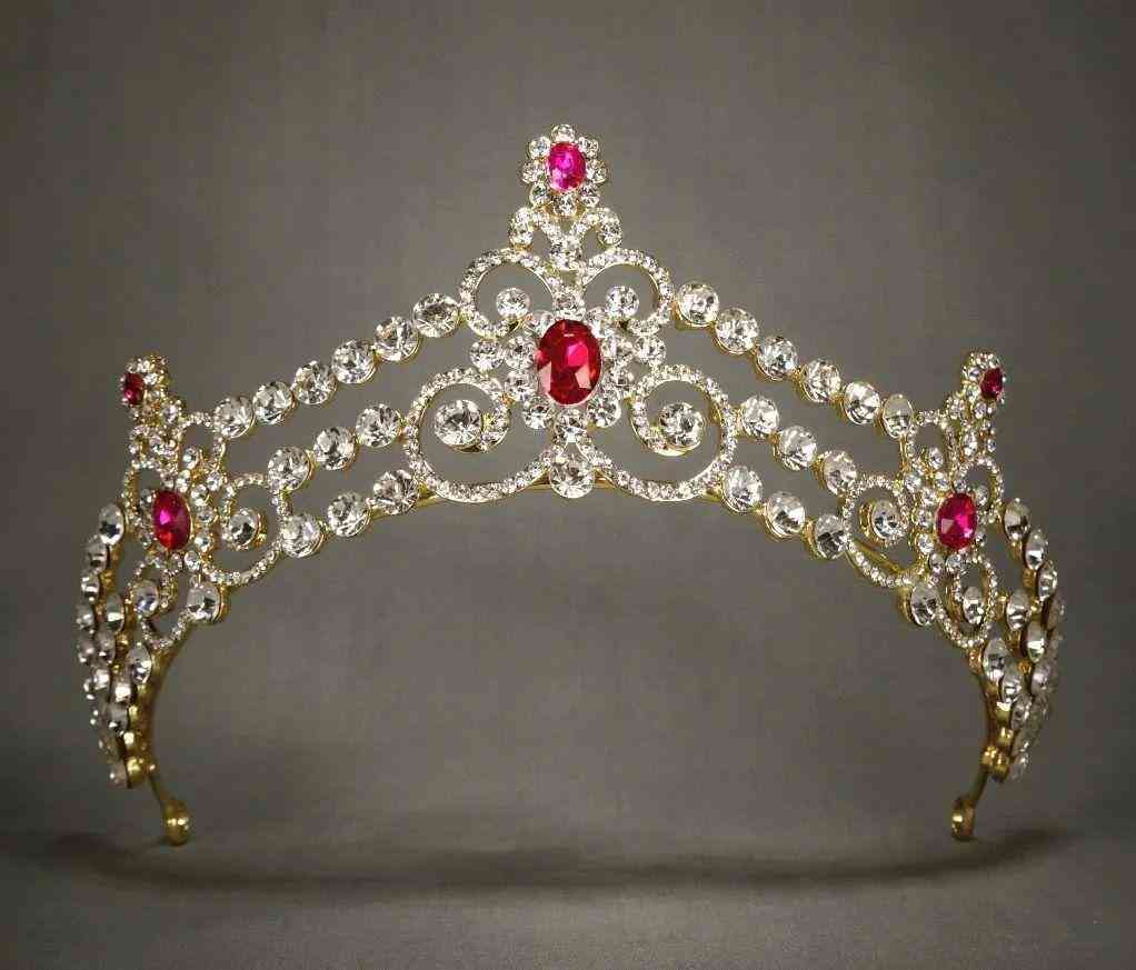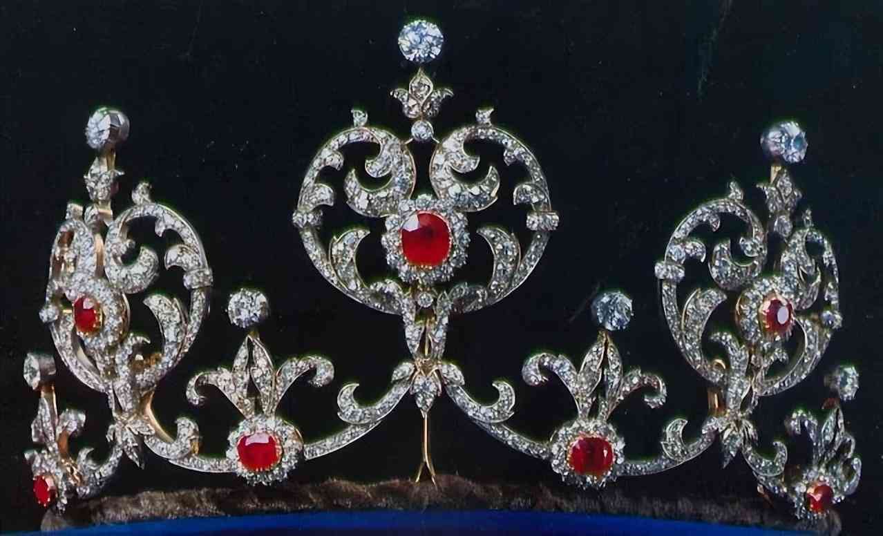 虽然希腊王朝已经不复存在,但希腊王室仍然保留着他们的传家宝和王室 Title。这顶“红宝石橄榄花环冠冕”的位拥有者是奥尔加王后。她是一位来自俄罗斯的公主,16 岁嫁入了希腊王室,她的丈夫,希腊国王乔治一世购买了鸽血红红宝石为妻子定制了这顶冠冕。