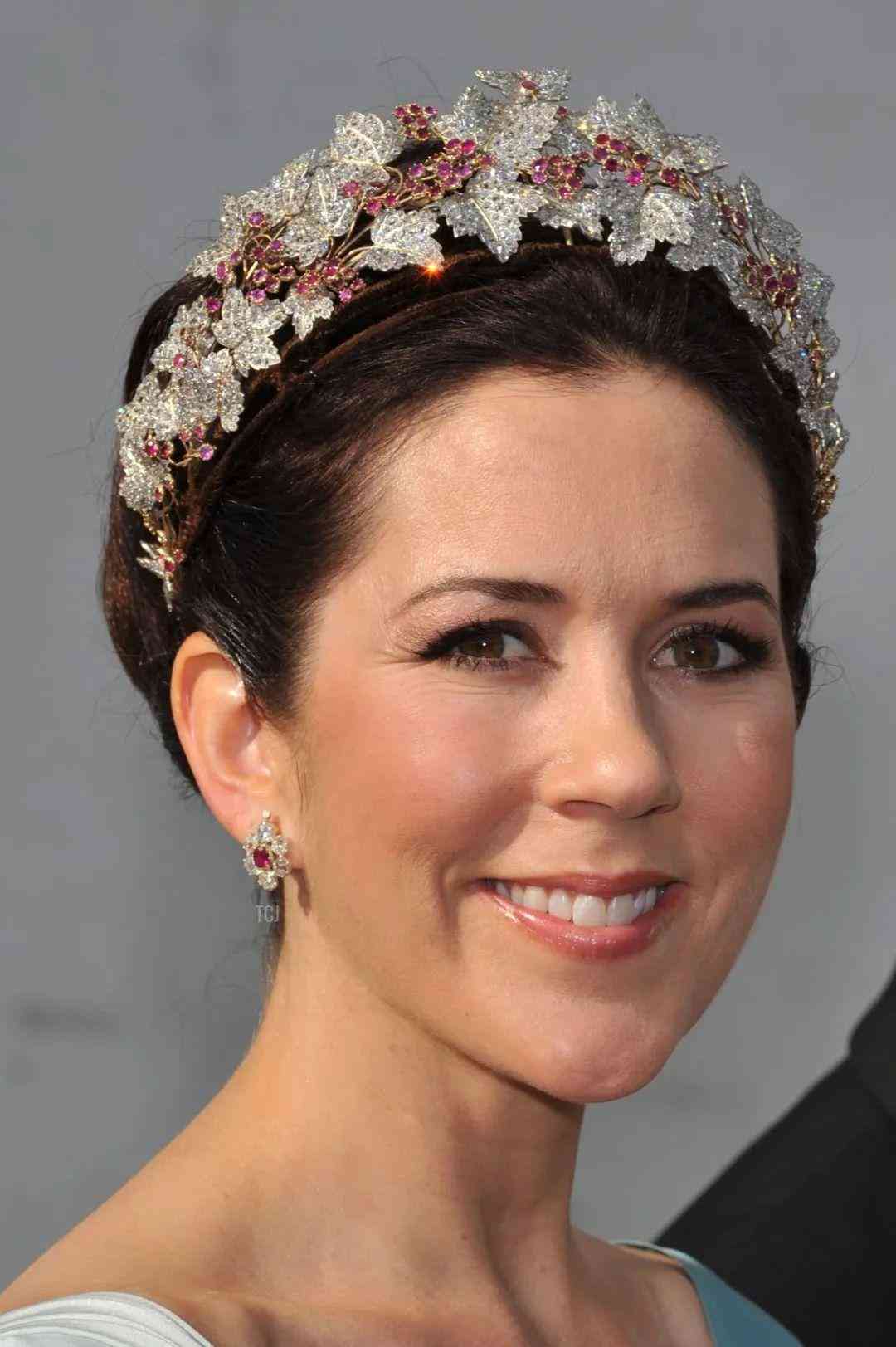 丹麦的玛丽王妃最常佩戴的冠冕就是这顶 The Danish Ruby Parure Tiara,这是一整个红宝石套装的一部分,也是她嫁入王室后得到的件华丽隆重的珠宝。这顶冠冕的历史可以追随到拿破仑王朝,历经若干王朝变迁,最终当时嫁入丹麦王室英格丽德王后改造成现在的样式。在她去世后,将这套红宝石套装留给当时王储弗雷德里克,而他爱上平民出身的玛丽,这顶冠冕也就成为了玛丽王妃被认可的重要证明。