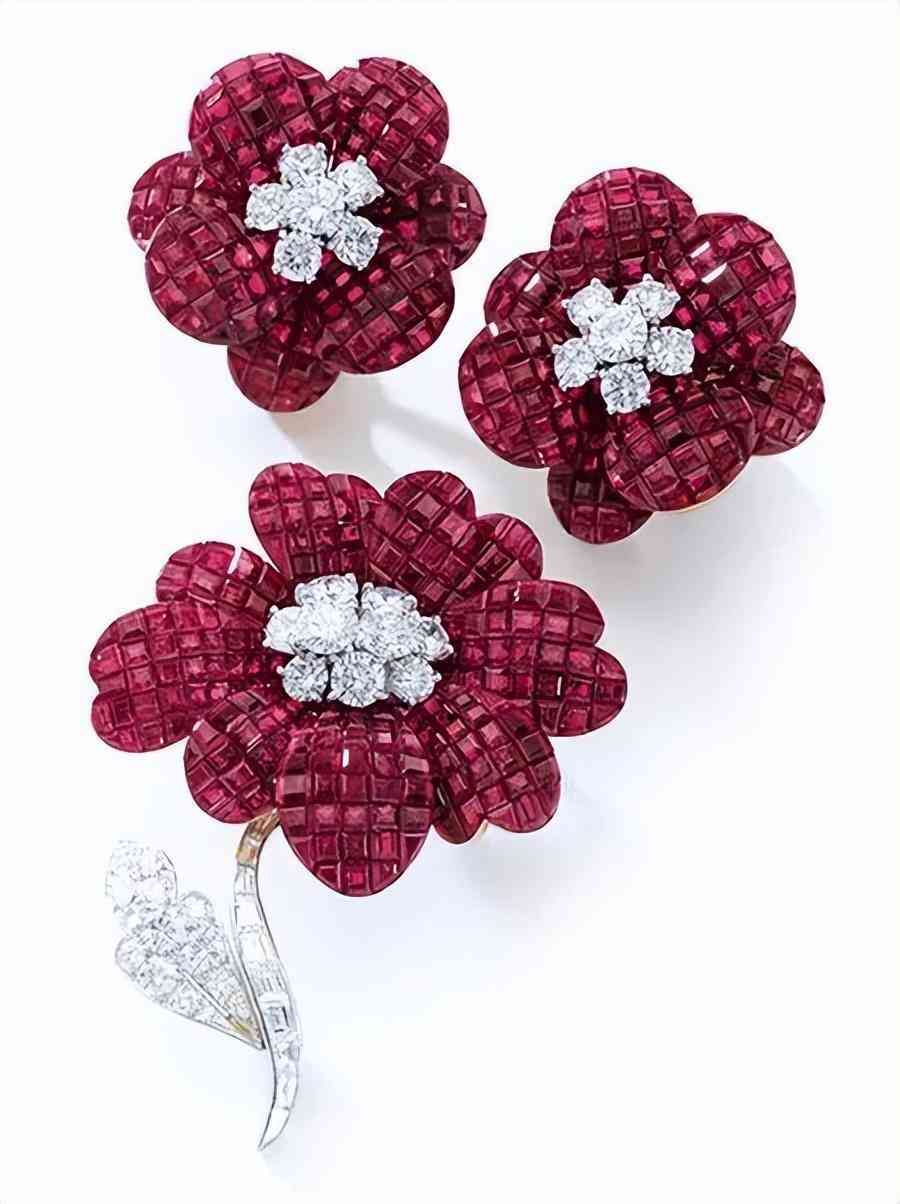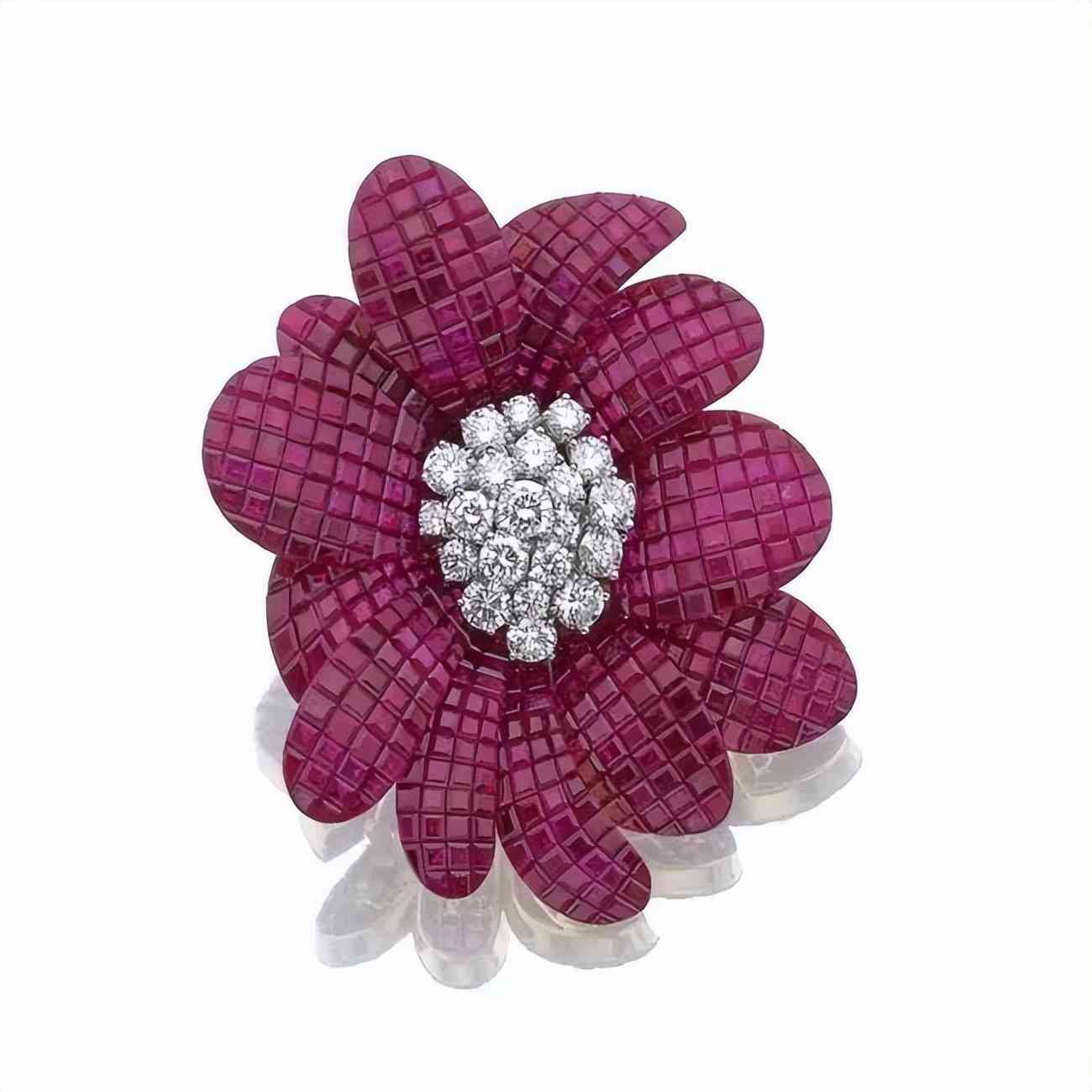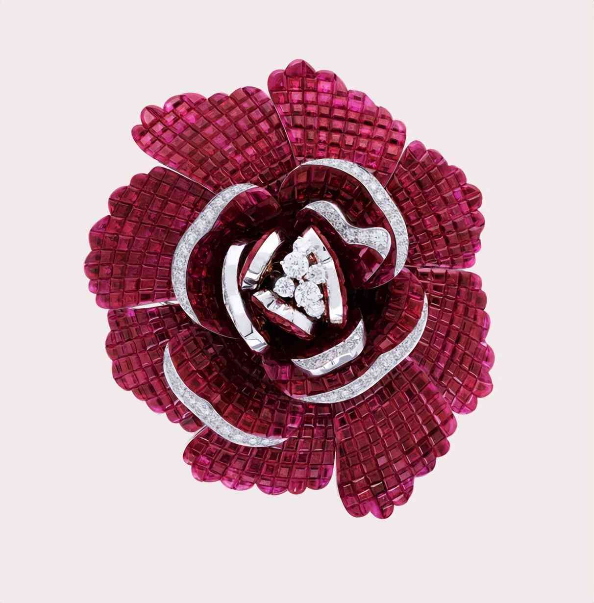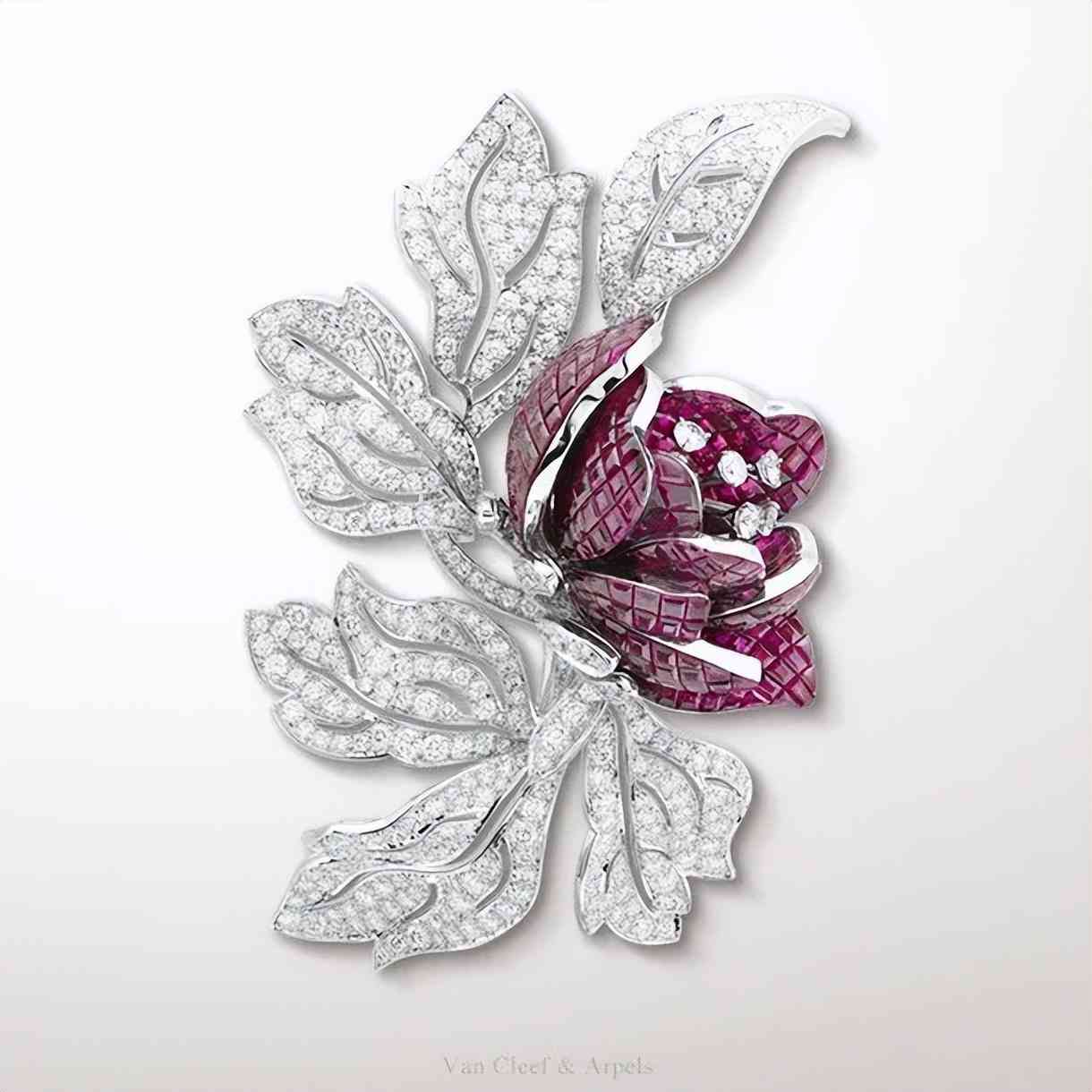 梵克雅宝秘笈–隐密式镶嵌太适合红宝石发挥所长了,它对宝石硬度有要求,所以一般情况都使用的是三大经典宝石,红宝石更是其中翘楚;第二,它不怕宝石颗粒小,因为全部要切割成各种小颗粒来重新排列组合;第三,它无边镶嵌的优势让红宝石延展了可塑性,可以任意组成各种造型,尤其是花卉,没有宝石能比红宝石更适合展现花卉珠宝的艳丽雍容。