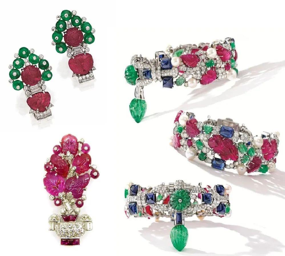 卡地亚的红宝石佳作太多了,比如为伊丽莎白泰勒打造的红宝石套装,为但最能展现其技艺和红宝石特色的应该是运用了宝石雕刻技艺的“水果锦囊”系列。这一珠宝风格兴起于 1920 年代,将彩色宝石雕琢为生动的叶片、花蕾与浆果,镶嵌于铂金枝条之上,虽然采用了大量的彩色宝石,但红宝石确实最能代表“果实”的必备之物。