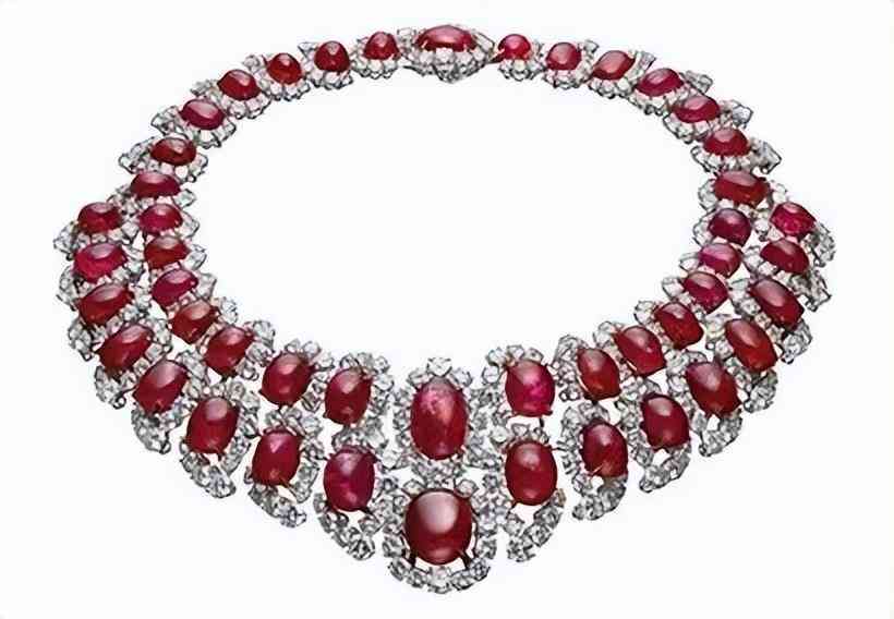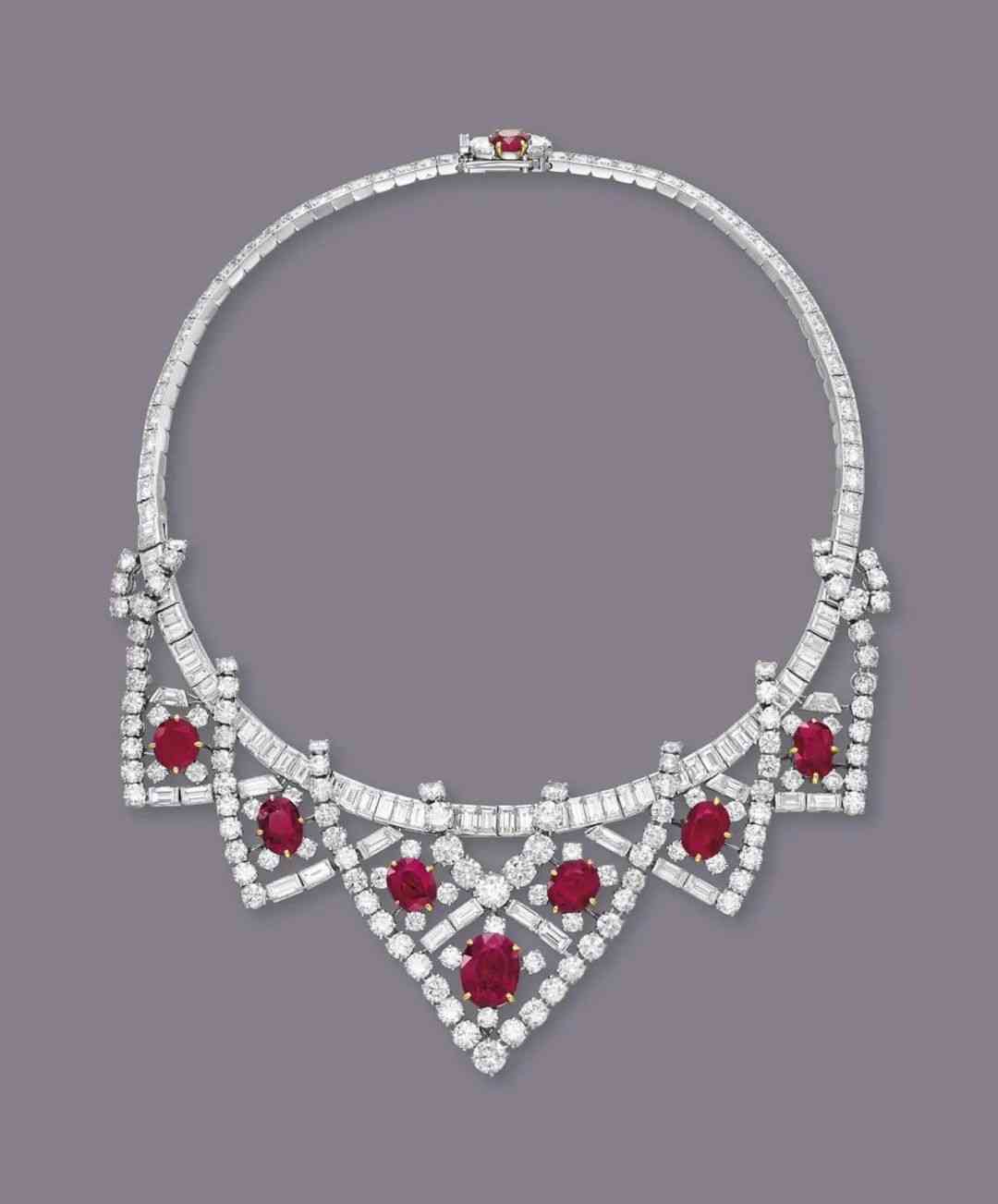 这条红宝石钻石项链来自卡地亚,非常典型的围兜项链设计,由圆形和长方形切割钻石格子围兜组成。镶嵌了七颗枕形和椭圆形红宝石。迈克·托德将它买下送给了项链送给了伊丽莎白·泰勒。2011 年 12 月,项链在佳士得拍卖,成交价为 115,932,000 美元。