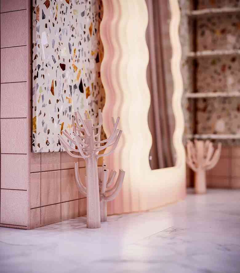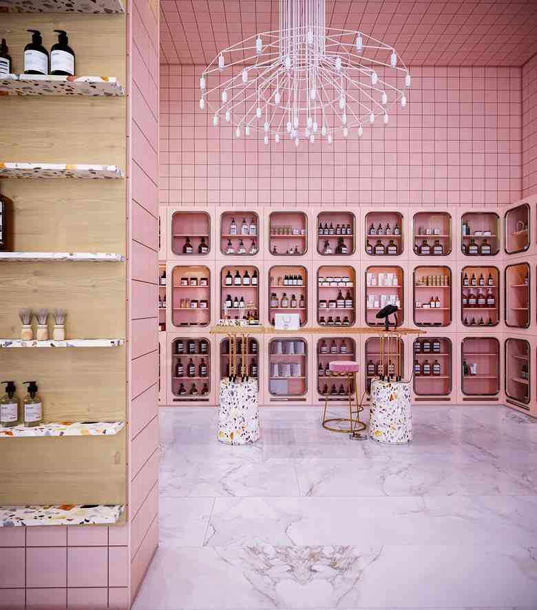 粉色+粉色,是最为省力且讨喜的搭配,墙壁和天花板皆使用粉色方砖铺贴,空间内辅之以浅灰色地板、斑点水磨石、以及金属细节,与圆形和拱形的几何图形结合,为空间注入了甜美的气息。