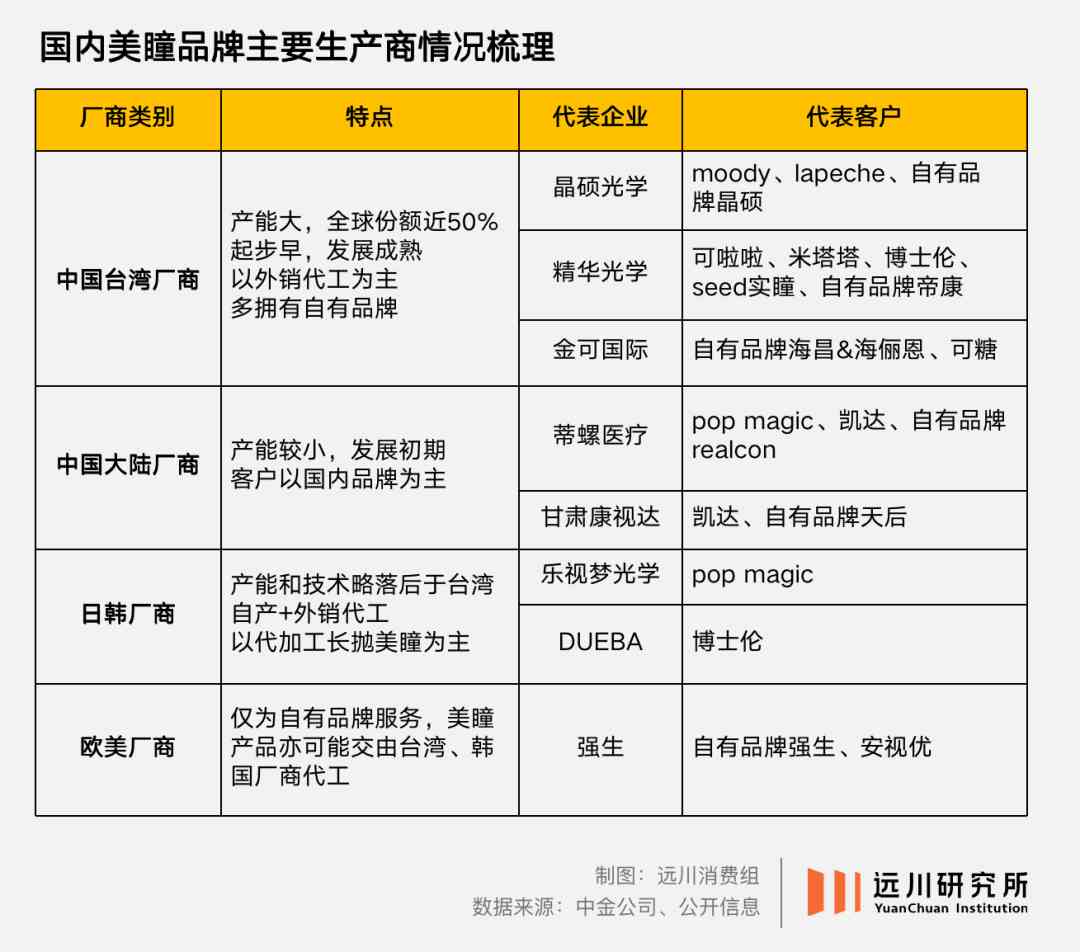中游制造环节则是台湾同胞的天下。据中金公司统计,国内Top20的美瞳品牌中,有65%由台湾厂商生产,只有15%来自大陆厂商[8]。