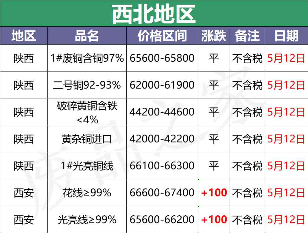 5月12日起,江西越兴铜业废铜收货价:缆粗66400元/吨,清光亮66300元/吨,光亮66200元/吨(调整为不含税价)。