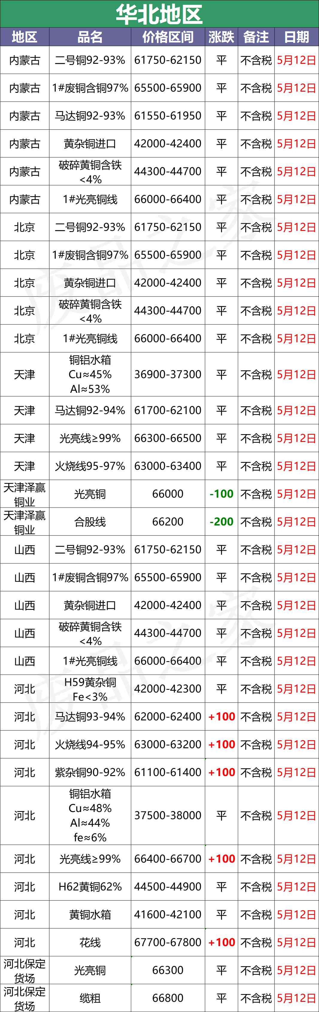5月12日起,河北保定货场废铜采购价:合股66800元/吨。