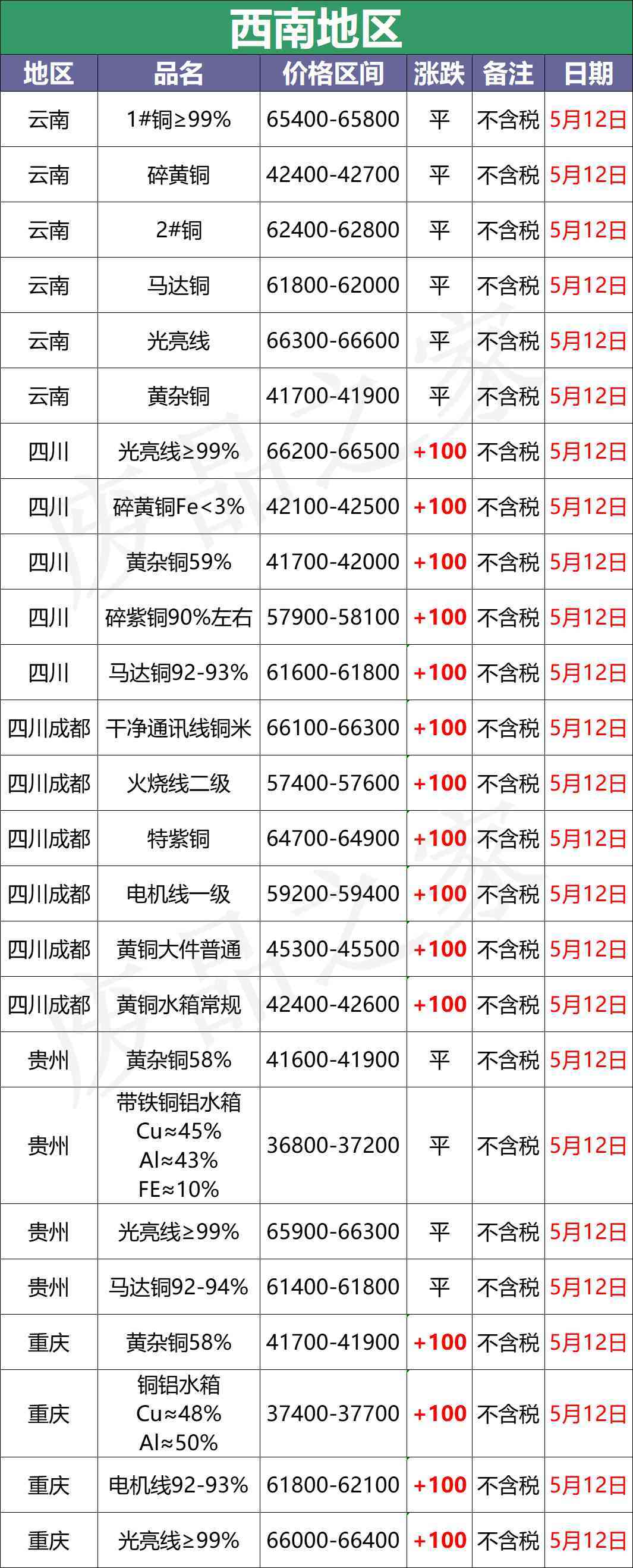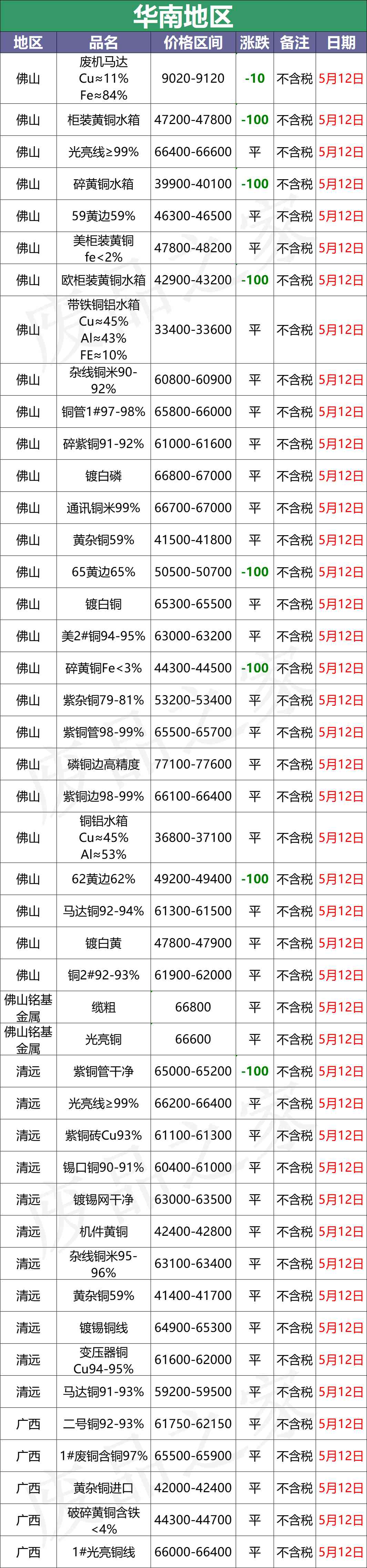 5月12日起,广东清远鹏宇货场废铜收货价:亮铜66300,缆粗66500、铜管63300-65300,漆包线61300-63300,大黄铜42800、黄铜41800、干净黄铜水箱43800、热水器铜50300,铜铝水箱38600(扣6个点)。