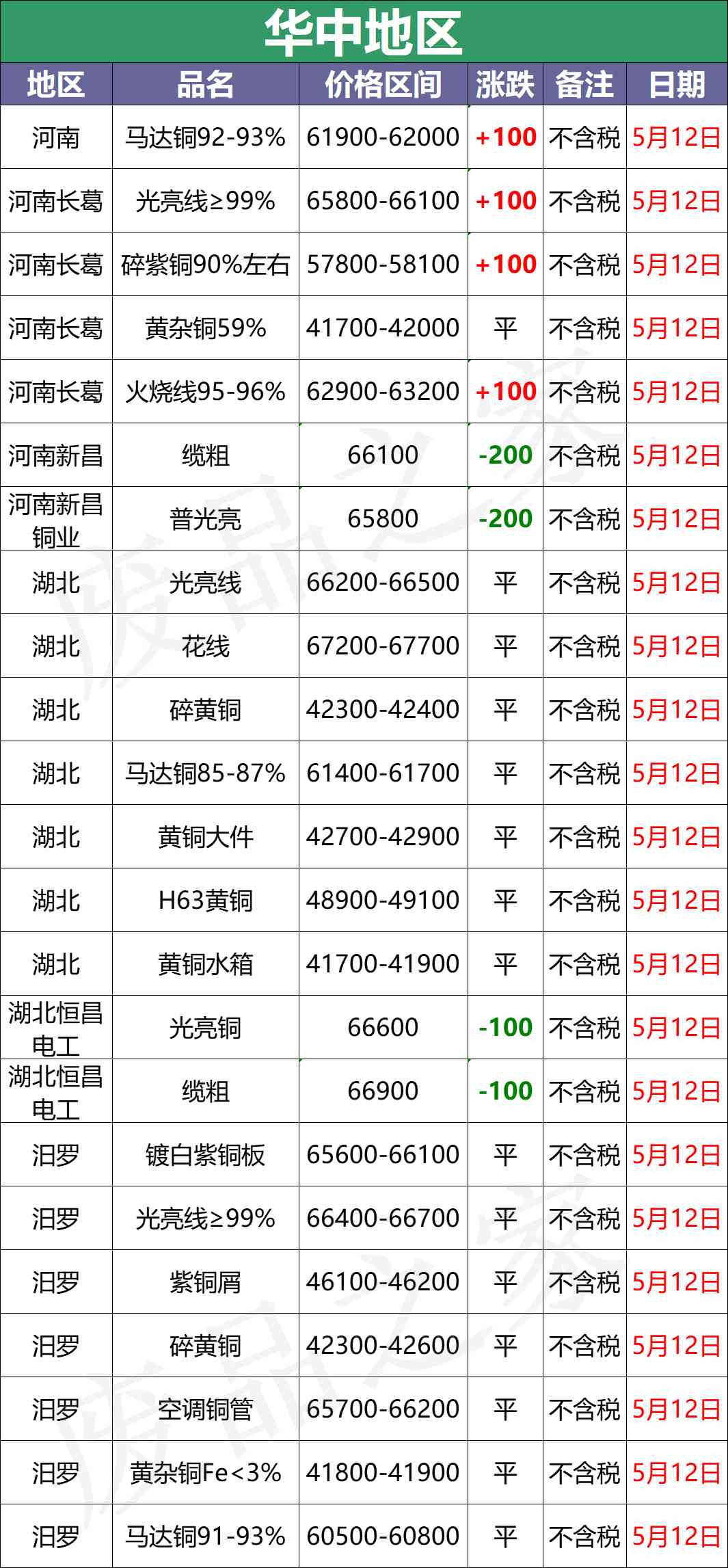 二次调价▼5月12日起,河南新昌铜业废铜采购价下调300:普光亮铜66000元/吨,缆粗66300元/吨。