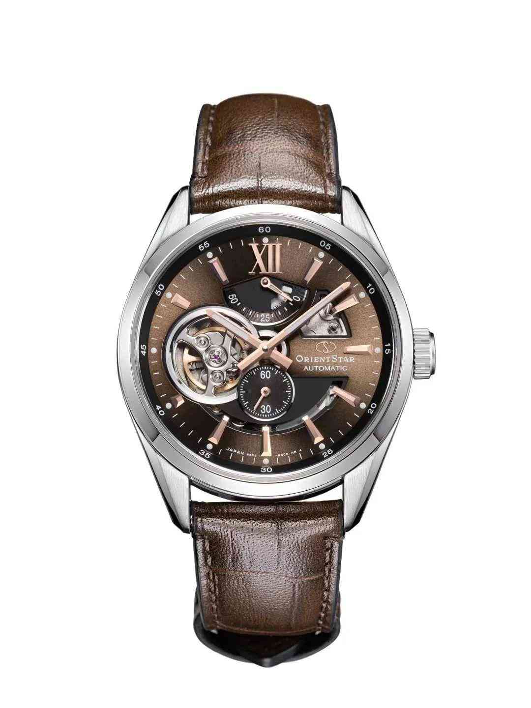 以棕色为主题色,表盘上设置了不对称笑脸镂空设计,在保持了稳重感的同时,还能为佩戴者增加一些探索机械表内部构造的乐趣。