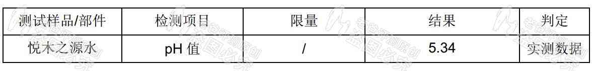 悦木之源水的pH为 5.34,属于弱酸,与人体 pH 接近,温和性较好,刺激小。