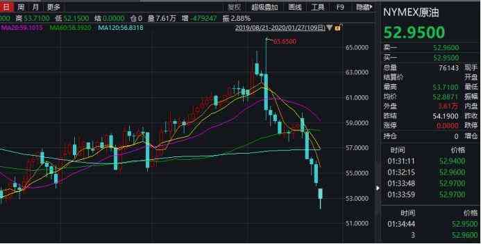 商品期货方面,北京时间1月27日白天,国际油价继续显著下挫,NYME原油期货主力合约最低已跌至52美元左右,盘中跌幅一度超过3%,就在1月上旬,该合约价格还一度超过65美元,在短短20天的时间,累计最大跌幅已约两成。